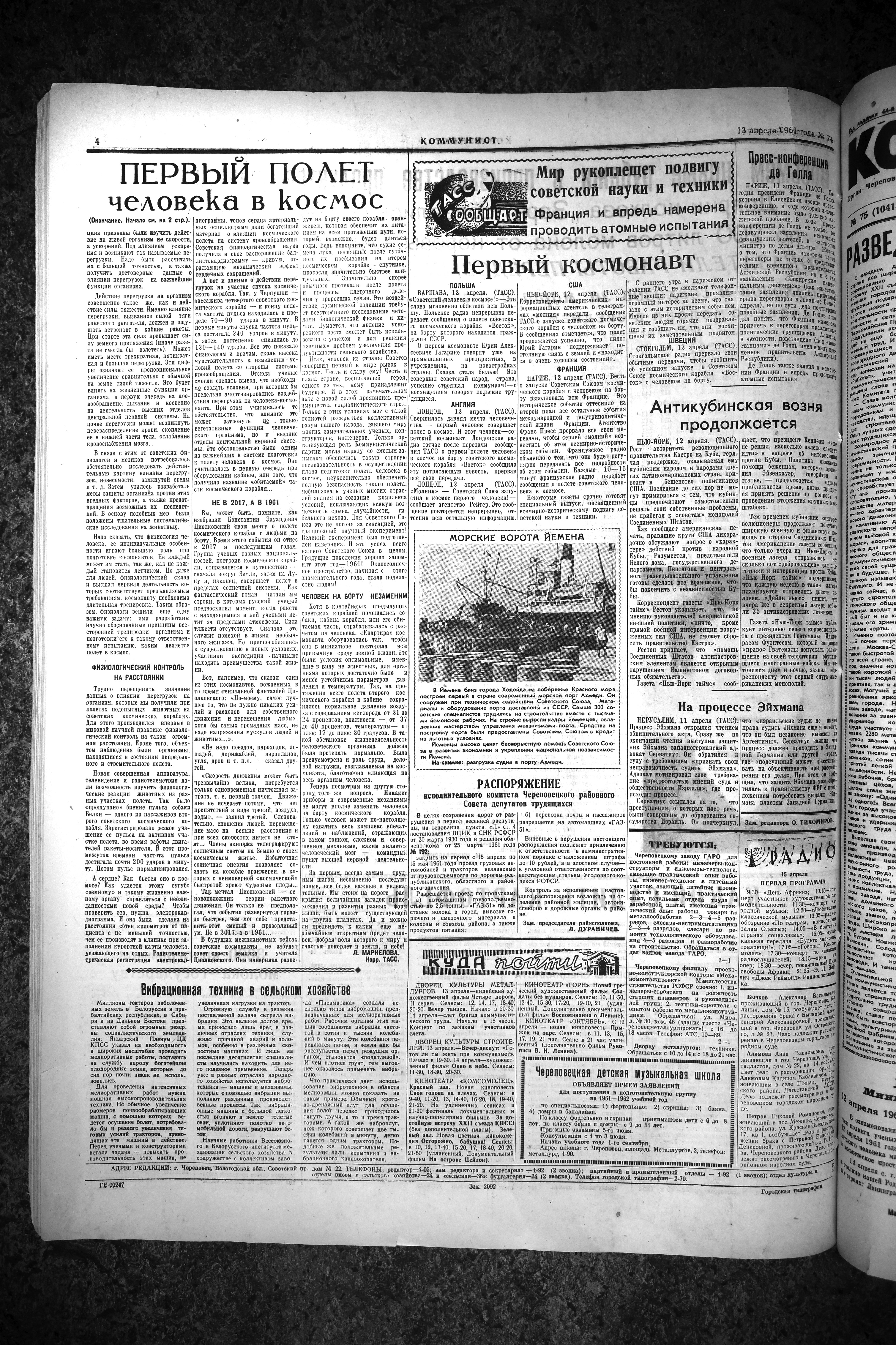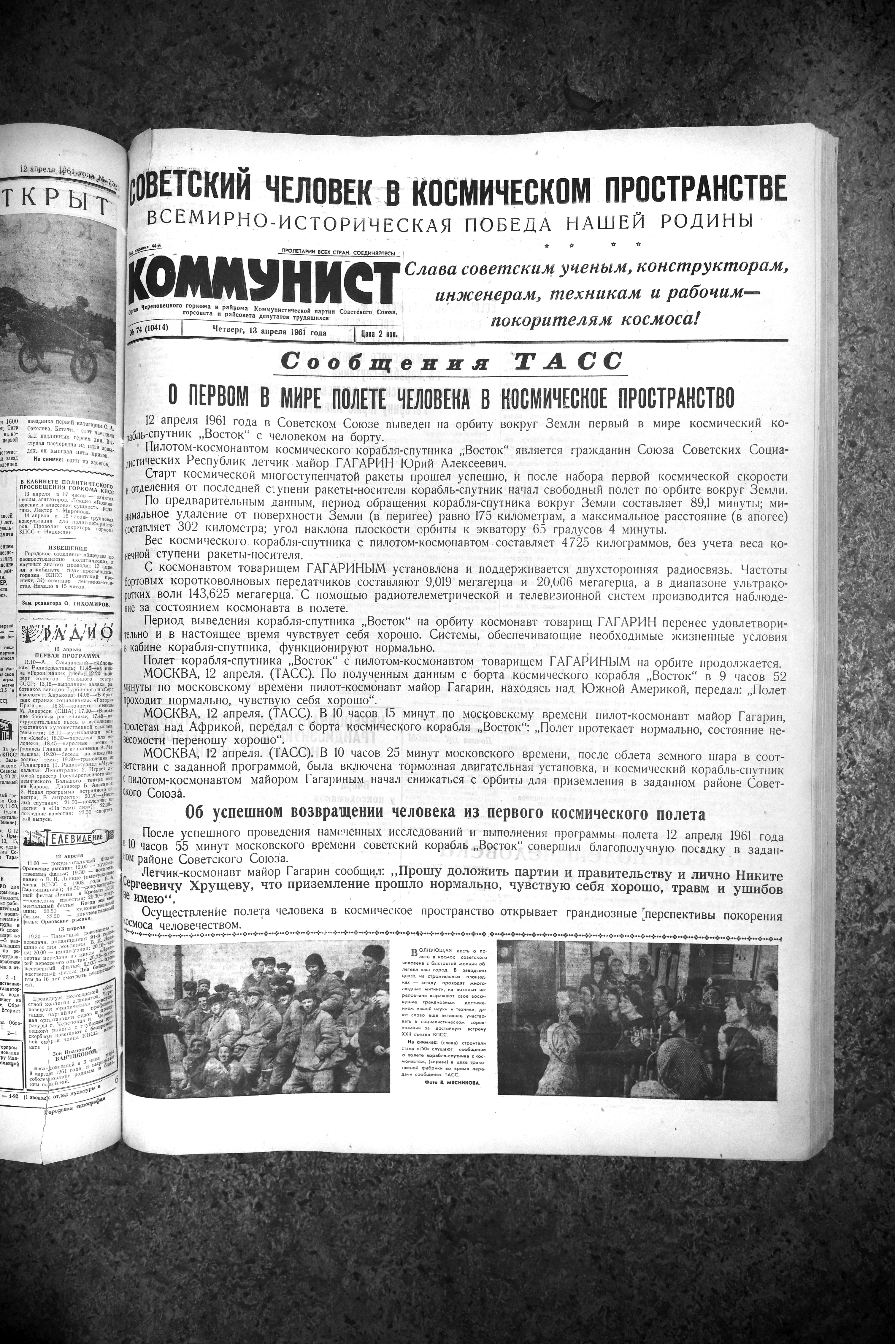 С первых же космических выпусков «Коммунист» стал публиковать письма череповецких заводчан и колхозников из окрестных сел. Печатались фотографии из цехов и колхозов, на которых люди собрались вокруг радио и внимательно слушают сообщения.