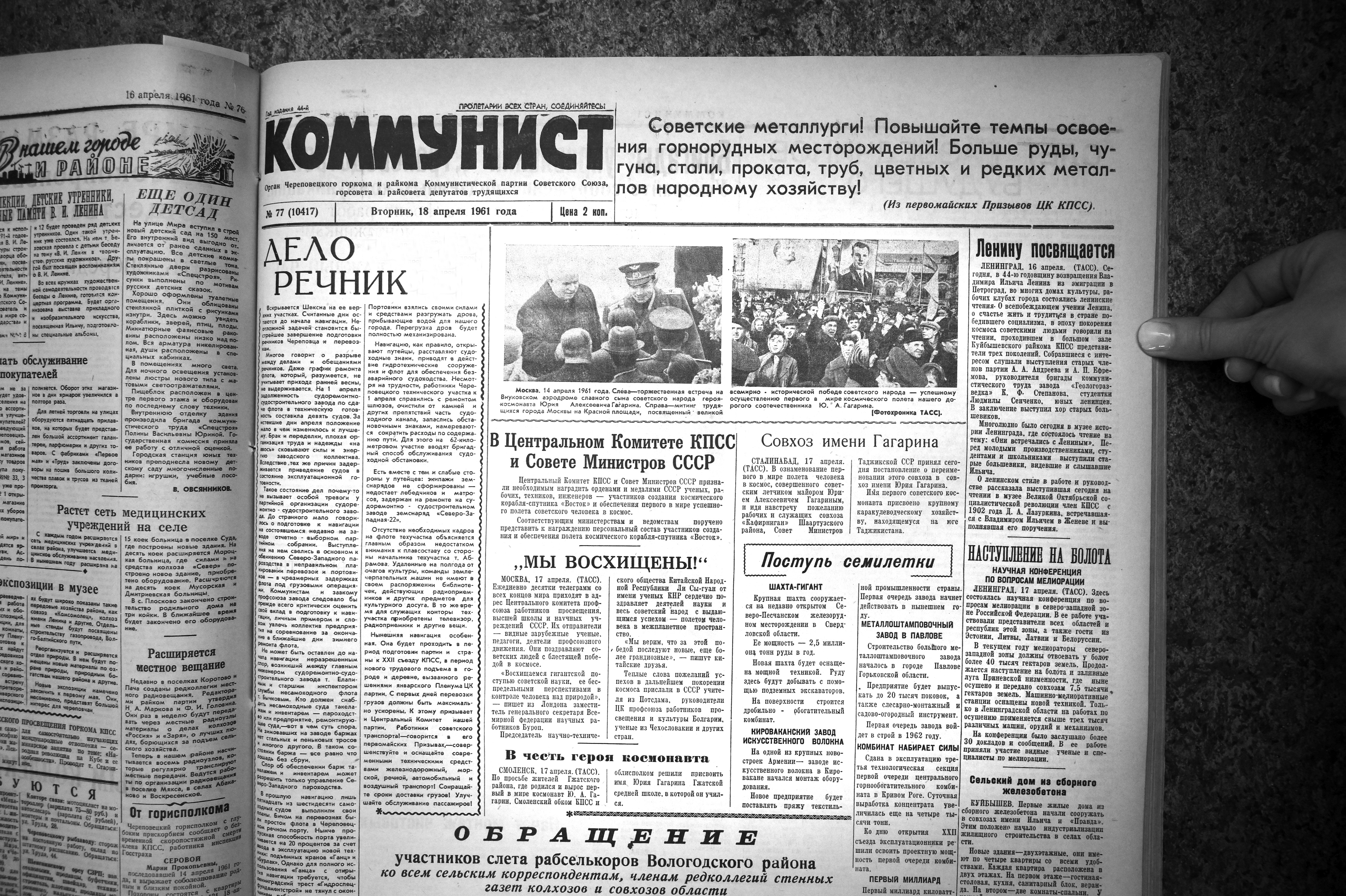 «Волнующая весть о полете в космос советского человека с быстротой молнии облетела наш город, — сообщал «Коммунист». — В заводских цехах, на строительных площадках — всюду проходят многолюдные митинги, череповчане выражают свое восхищение грандиозным достижением нашей науки и техники».