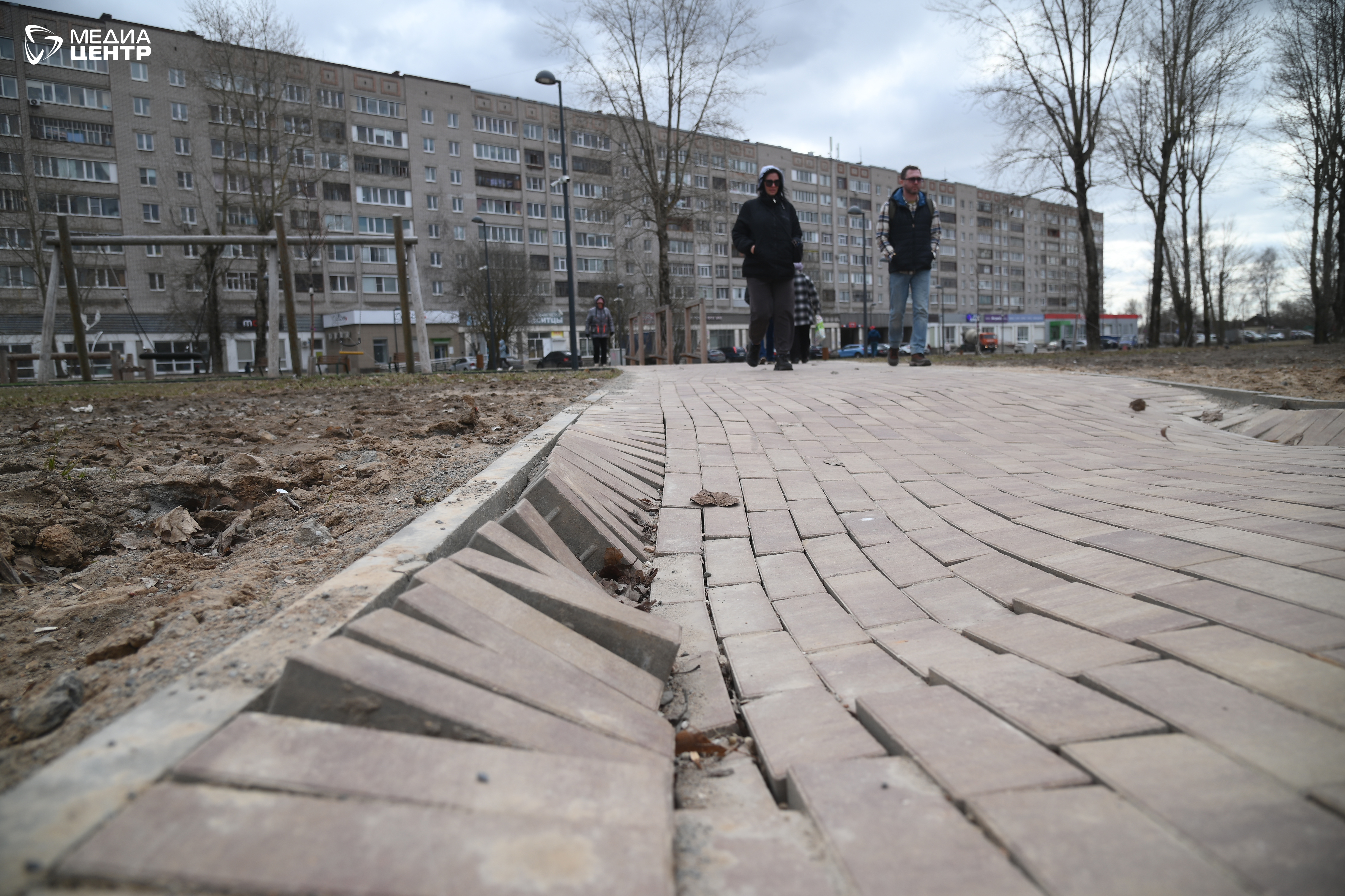 Нужно чинить и одну из пешеходных дорожек: грунт под ней провалился, а отдельные плитки вылетели, что является поводом обратить внимание подрядчика на соблюдение гарантийных обязательств.
