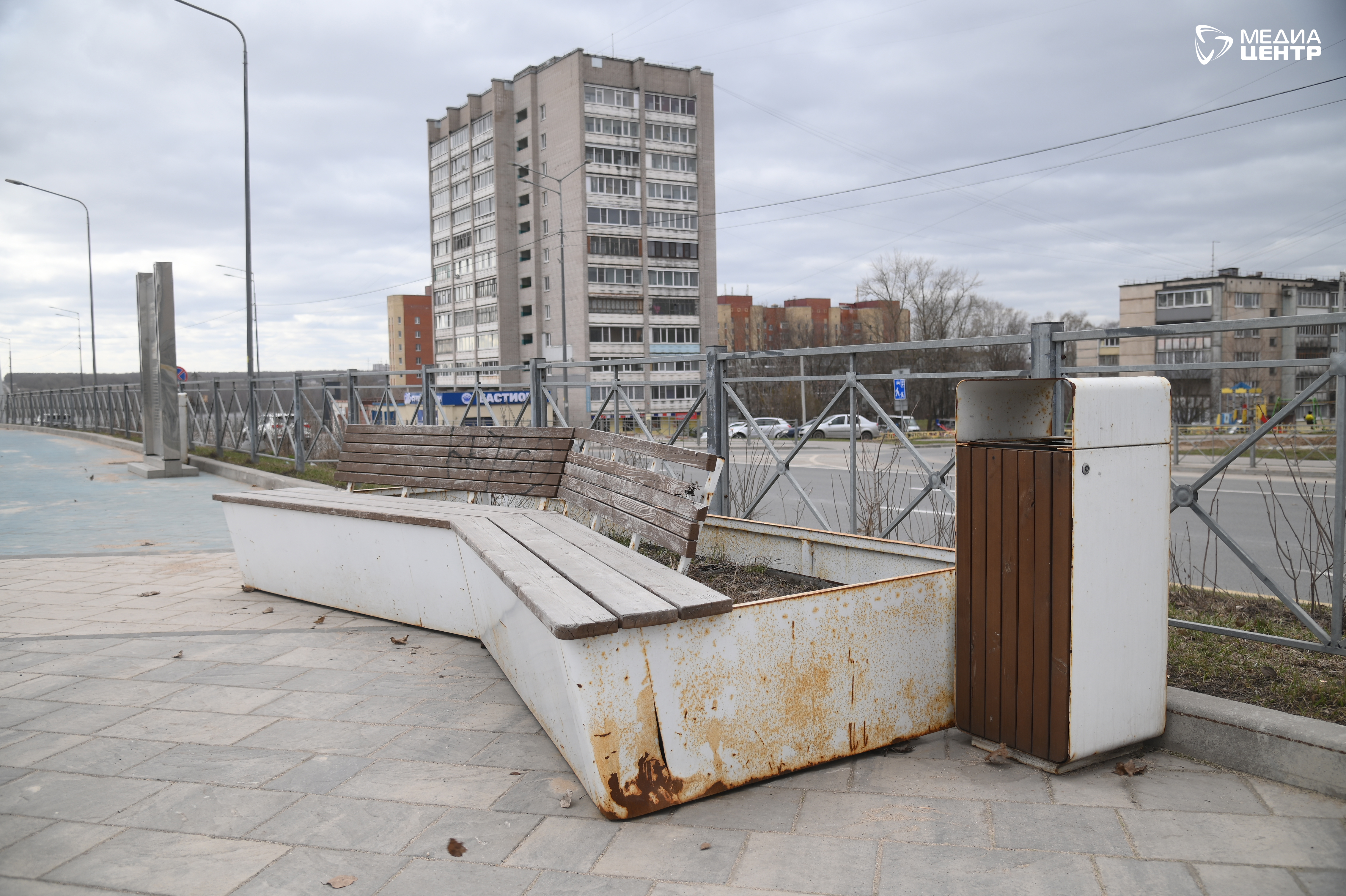 Расположенная по соседству смотровая площадка с видом на Архангельский мост — еще одно тому подтверждение. Под ногами много песка, а металлические части так называемых малых архитектурных форм уже покрыты ржавчиной и нуждаются хотя бы в покраске.