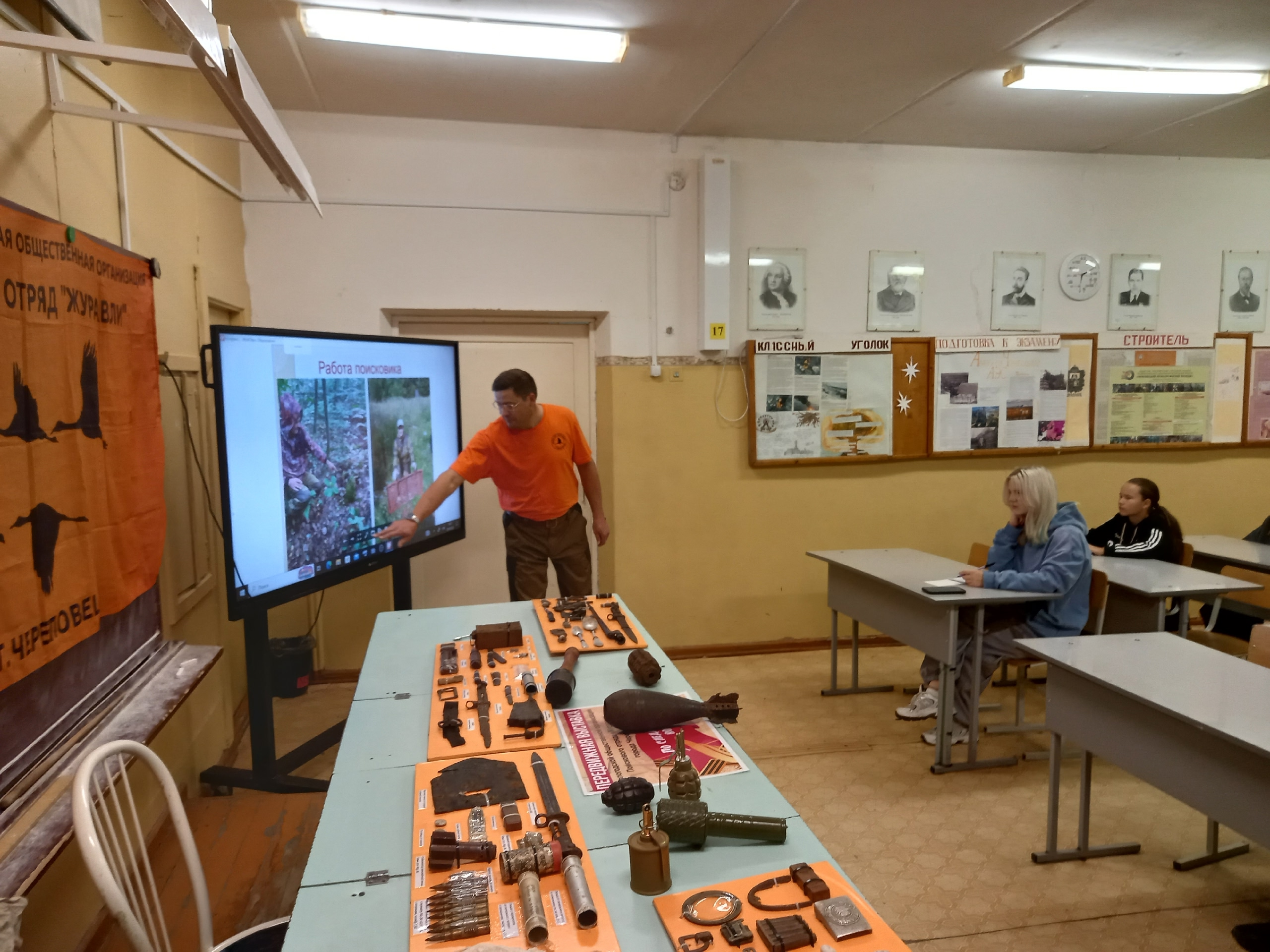 Первые занятия были посвящены важной теме «Безопасность при проведении поисковых работ. Виды взрывоопасных предметов». Учитель истории продемонстрировал массогабаритные макеты, которые не содержат взрывчатых веществ и средств взрывания, а также наглядно показал юным поисковикам устройство основных боеприпасов советской и германской армий. Школьники увлеченно слушали и задавали вопросы Василию Юрьевичу, а экспонаты и макеты просто не выпускали из рук. На следующих занятиях с Василием Кочуровым ребята изучили особенности обмундирования и вооружения военнослужащих Красной Армии и армии вермахта периода 1941–1945 годов. Эти знания необходимы для идентификации останков погибших бойцов и командиров Красной Армии при проведении полевых поисковых работ.