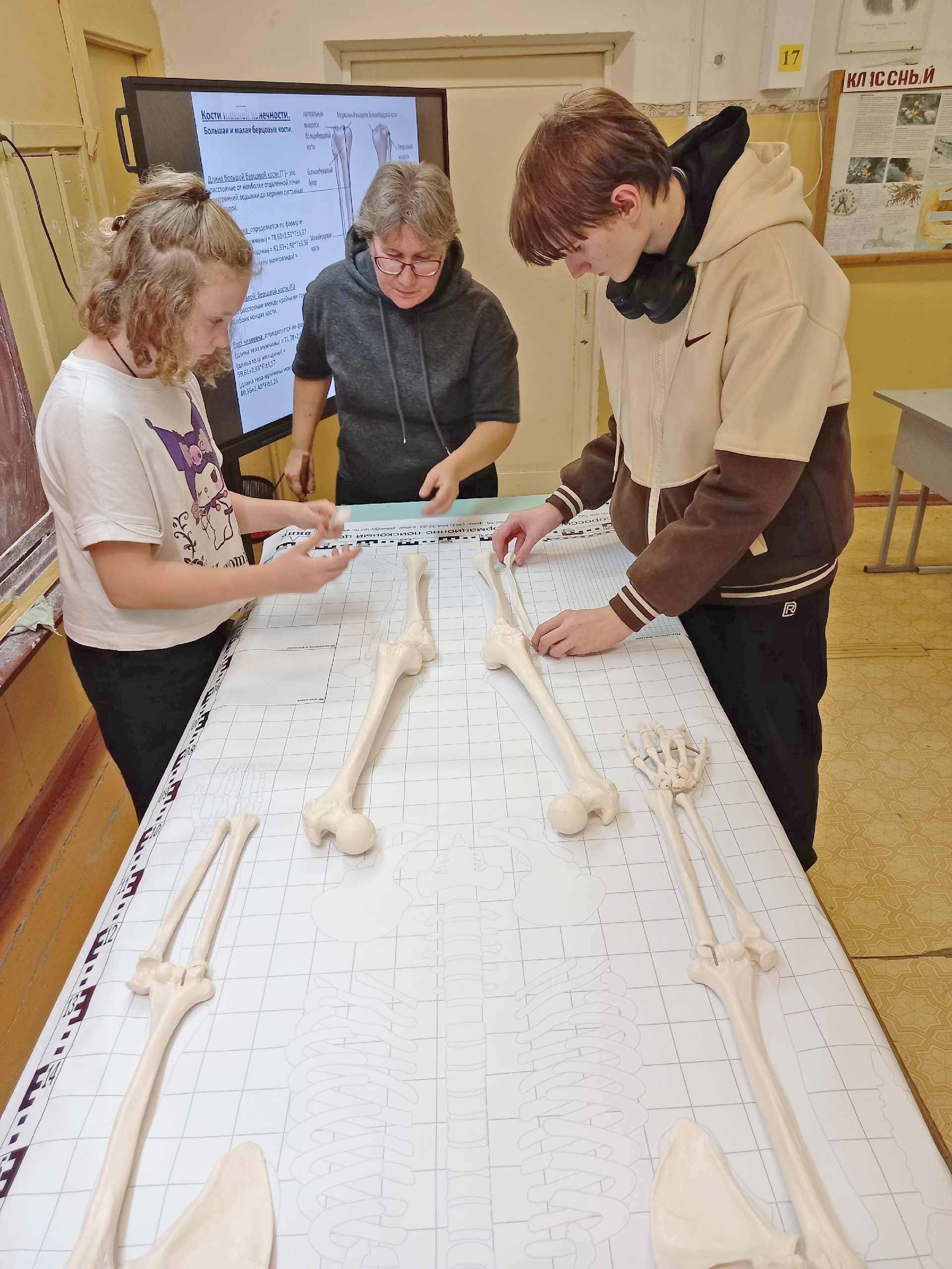 Эксперт «Школы юного поисковика» — учитель биологии школы № 27 Ирина Смирнова — провела занятие по антропологии, на котором рассказала ребятам об особенностях человеческого скелета, возрастных изменениях. Ирина Викторовна поделилась опытом проведения эксгумационных работ, где основное внимание уделяется костным останкам. Антропология помогает установить многие характеристики человека — рост, пол, расу, необходимые для идентификации личности солдата Красной Армии. А это — главная цель в поисковой работе.