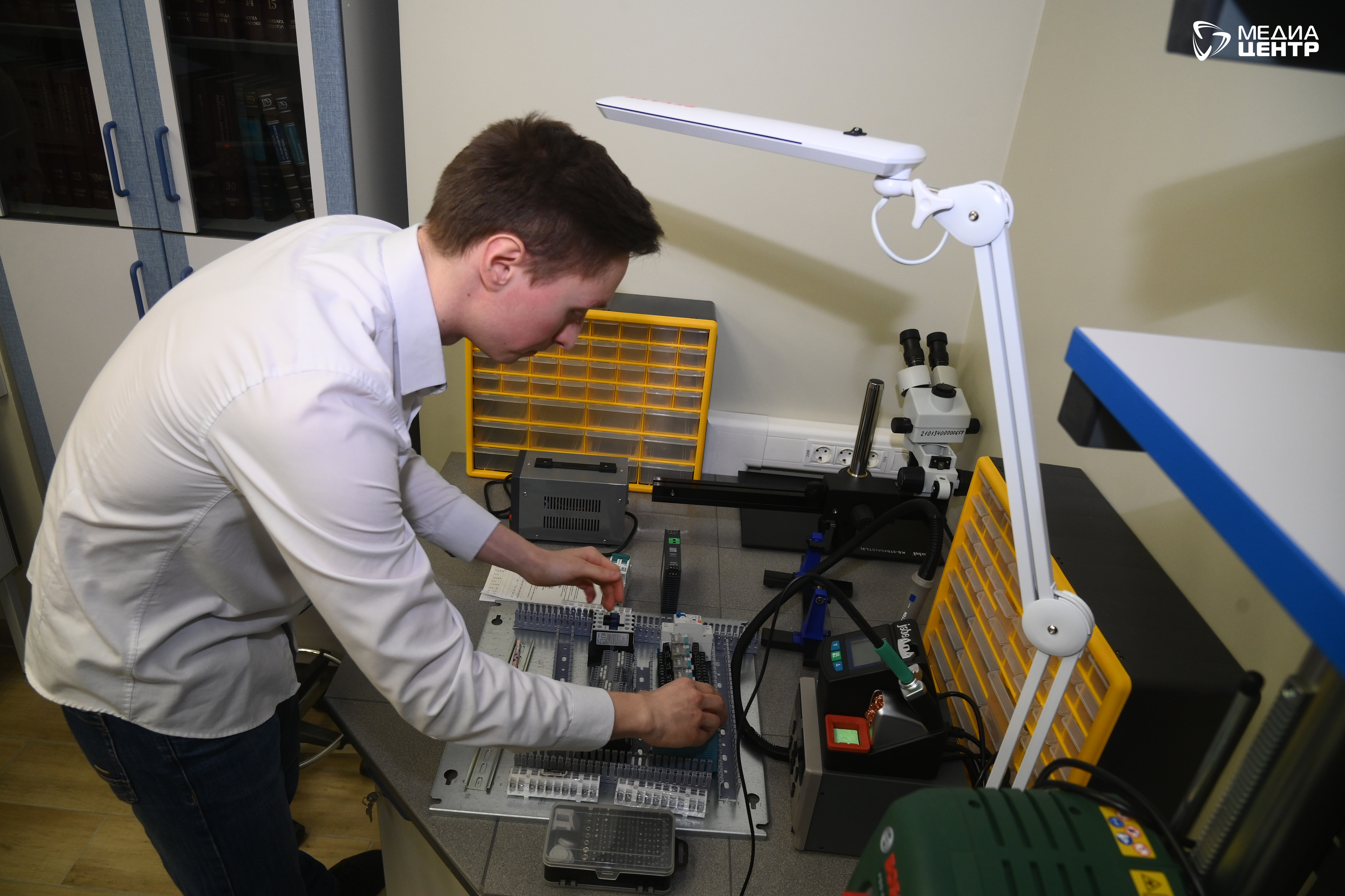 — Лабораторию можно назвать уникальной, ведь она дает возможность совместить три направления: научные разработки, учебный процесс и проектную работу по реальным заказам промышленности. Как правило, запросы от предприятий связаны с импортозамещением, то есть с разработкой проектов на отечественном оборудовании. Здесь мы готовим будущих инженеров-проектировщиков, конструкторов и исследователей. Здесь проводятся лабораторные работы по электротехнике, электронике, микроэлектронике, программированию контроллеров, — пояснил «Речи» Константин Харахнин, кандидат технических наук, доцент кафедры киберфизических систем ЧГУ.