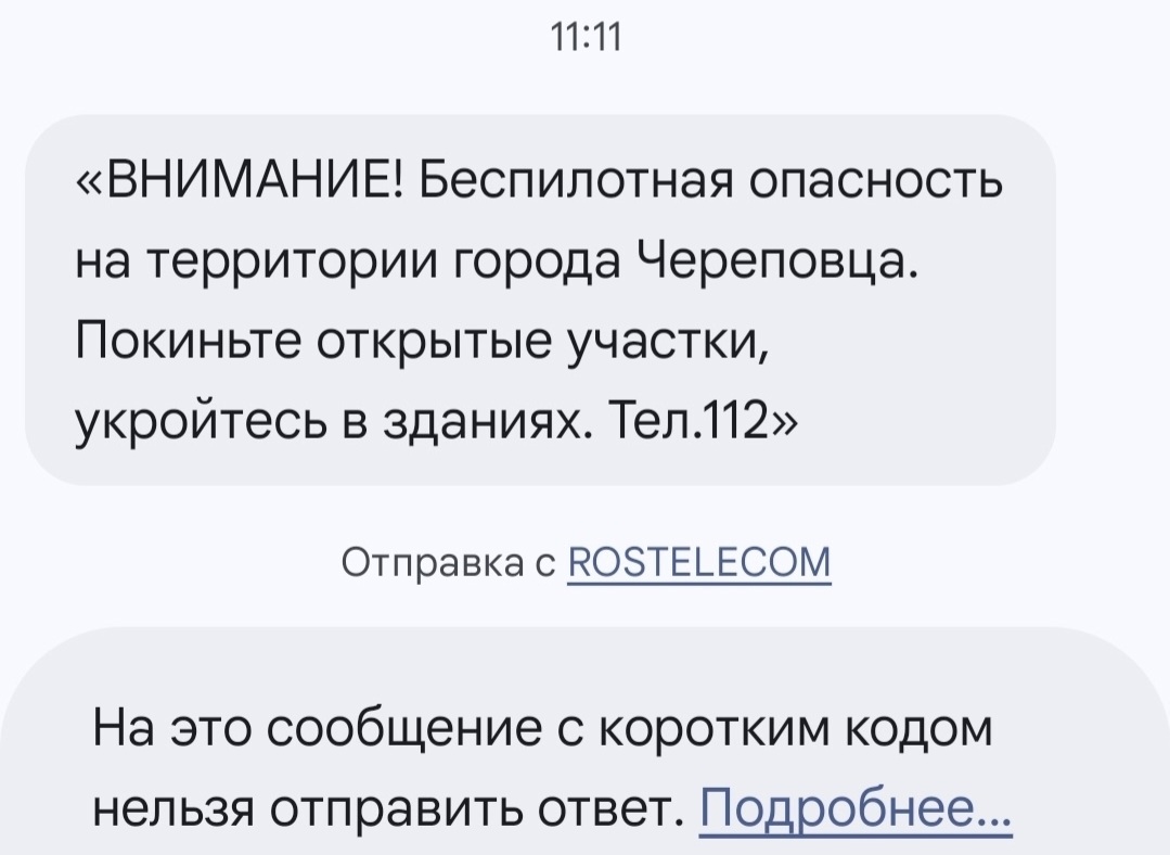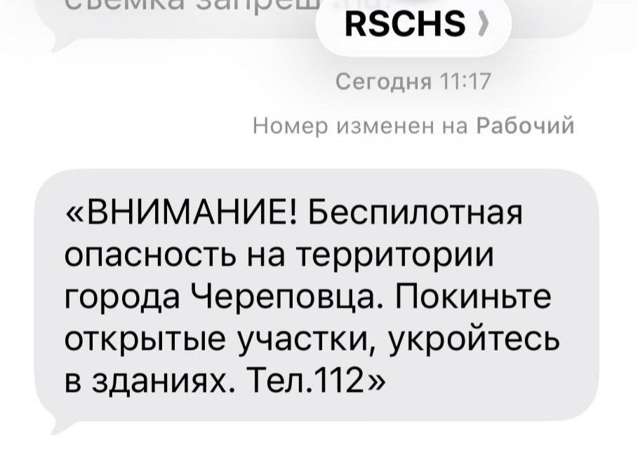 Жителей Череповца информируют об опасности с помощью SMS. На мобильные номера череповчан начали массово приходить уведомления о режиме «Беспилотная опасность» на территории города. В сообщениях гражданам рекомендуют немедленно покинуть открытые участки местности и укрыться в ближайших зданиях или других капитальных сооружениях. При нахождении в помещении советуют держаться подальше от окон.