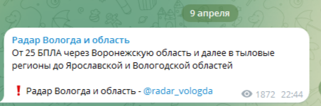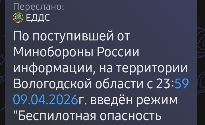 UPD: По поступившей от Минобороны России информации, на территории Вологодской области с 23:59 9 апреля введён режим «Беспилотная опасность».