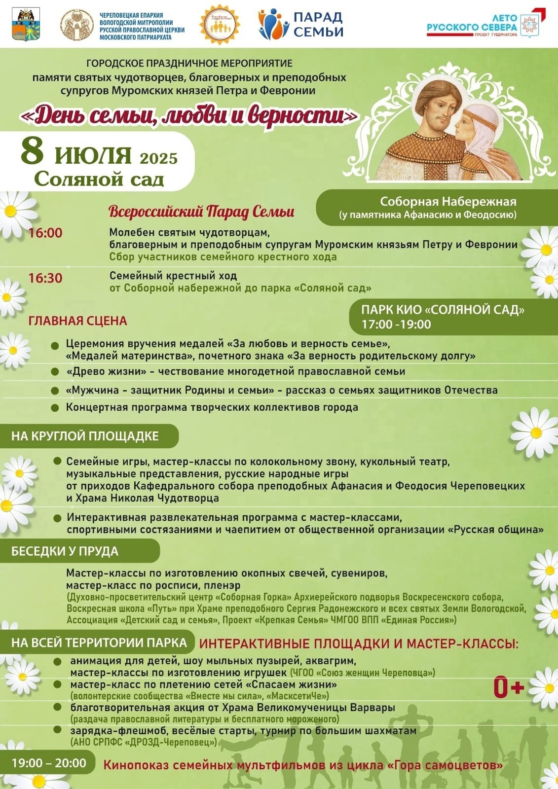 8 июля 2025 года Череповец, как и вся Россия, отмечает День семьи, любви и верности, приуроченный ко Дню памяти святых благоверных князей Петра и Февронии - покровителей семьи и брака. В Череповце этот праздник традиционно проходит с размахом и включает в себя множество мероприятий для семей.