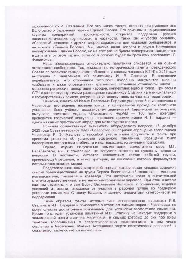 «Считаем необходимым обратить внимание на то, что эту инициативу продавливает губернатор Вологодской области, секретарь Вологодского регионального отделения партии "Единая Россия" Г. Филимонов и оказывает давление в её реализации на администрацию города Череповца. Такой подход противоречит идеологической установке и Вашей публичной позиции как высокоавторитетного Председателя Всероссийской политической партии "Единая Россия". Напомним Ваше высказывание: "Если говорить о Сталине и его окружении, то они совершили преступление и перед своим народом, и в определенном смысле перед историей"».Напомним, памятник Сталину и Бардину хотят поставить на улице Металлургов. Сейчас проходит конкурс заявок на лучший эскизный проект. В комиссии присутствует отец губернатора Вологодской области Юрий Филимонов.