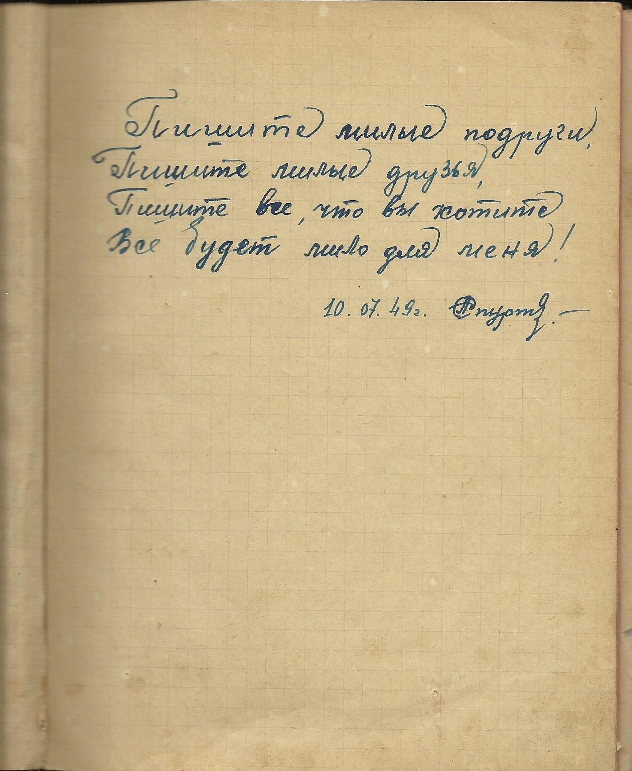 Как говорит Галина Александровна, папа не очень много рассказывал о войне, но мало и расспрашивали. Кто ж знал, что Александр Алексеевич уйдет из жизни так рано - он умер в 1988 году. До сих пор череповчанка хранит песенник своего отца 1947 - 1949 годов. На пожелтевших от времени страницах записаны (не только самим хозяином тетради, но и его друзьями) слова песен: «Летят перелетные птицы», «Вальс фронтовой весны», «Артиллерийская», из популярных тогда фильмов «Кубанские казаки», «Свинарка и пастух», народные «Рябина», «Окрасился месяц багрянцем», романсы «Мой костер в тумане светит», «Вот мчится тройка удалая…» и другие. Здесь же четверостишья о дружбе и любви. «Ту нить, что дружбою зовется, старайся бережно хранить, а если нить та оборвется, ее нельзя соединить. 1949 год»…