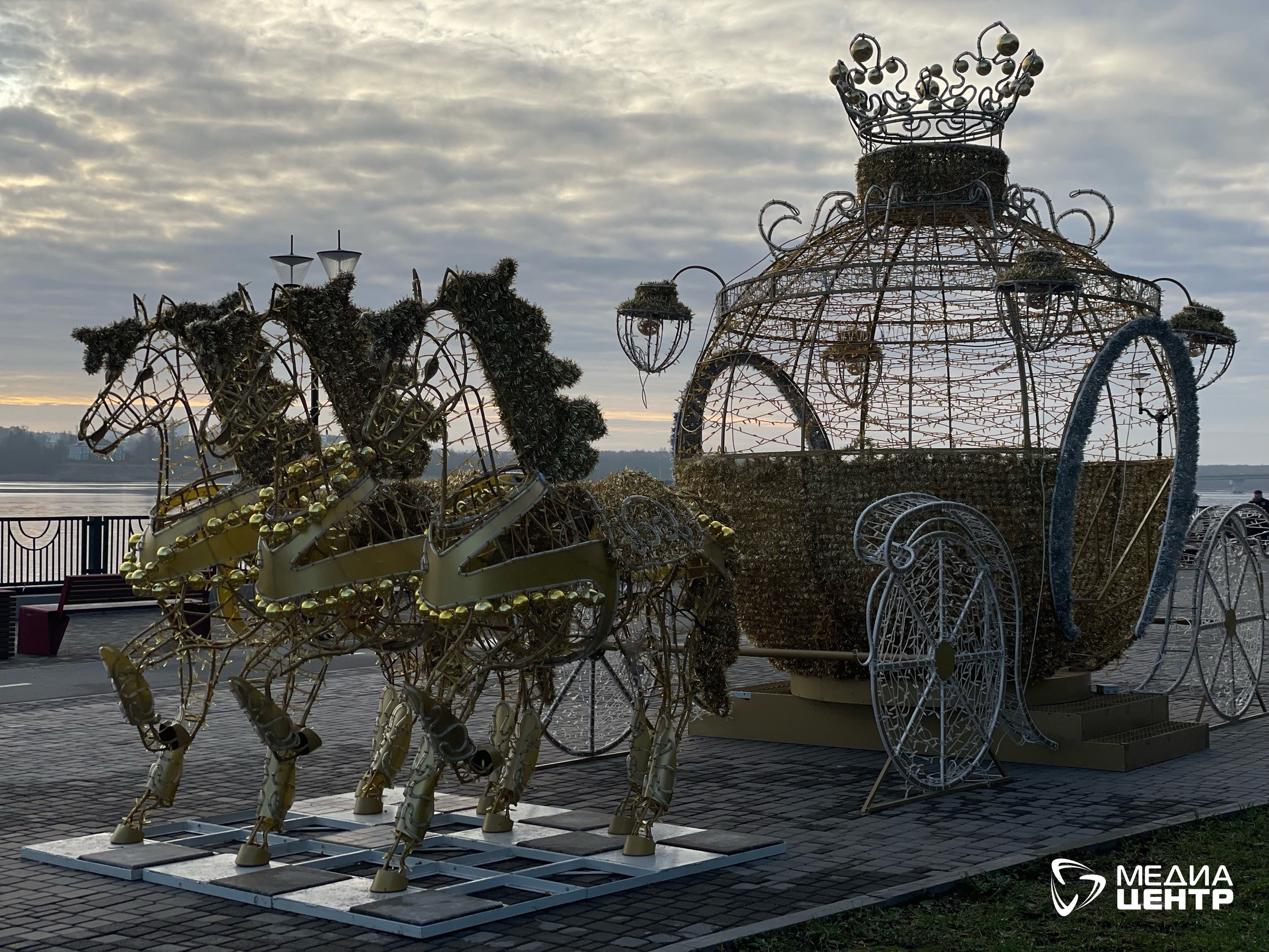 На набережной уже стоит золотая карета с тройкой лошадей, а рядом с памятником преподобным Афанасию и Феодосию — циферблат старинных часов.