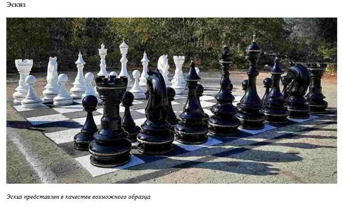 Центральным арт-объектом обновленного парка станут большие уличные шахматы. На них выделено почти 1,5 млн рублей. Подрядчику предстоит до 31 мая этого года поставить комплект из 32 фигур, выполненных из стеклопластика. Это будут не обычные шахматы, а настоящие парковые великаны. Согласно техзаданию, высота короля составит не менее 145 см, ферзя — 120 см, а самая маленькая фигура, пешка, будет высотой не менее 67 см. При этом общий вес набора не превысит 300 кг.
