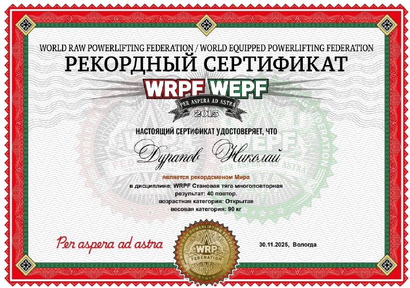 Это достижение позволило Николаю не только выполнить норматив «Мастера спорта международного класса», но и превзойти действующие мировые достижения. Ко Дню защитника Отечества спортсмен получил заветное удостоверение и официальный сертификат, подтверждающий рекорд мира.