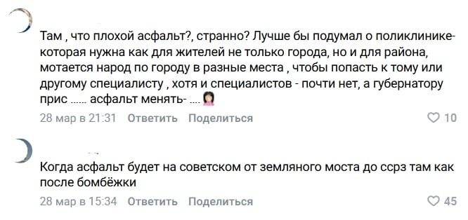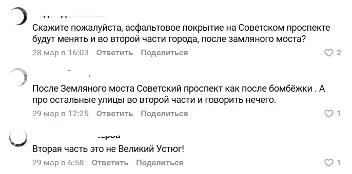 Впрочем, в комментариях жители не разделили радости господина Быкова по поводу того, что реконструкция станет такой уж «долгожданной». Народный оппонент справедливо замечает: если уж вскрывать улицы, то почему бы не обратить внимание на другие дороги. Например, на участок от Земляного моста до улицы Щелкунова? Там-то дорожное покрытие выглядит куда печальнее, чем на вполне приличном центральном отрезке.