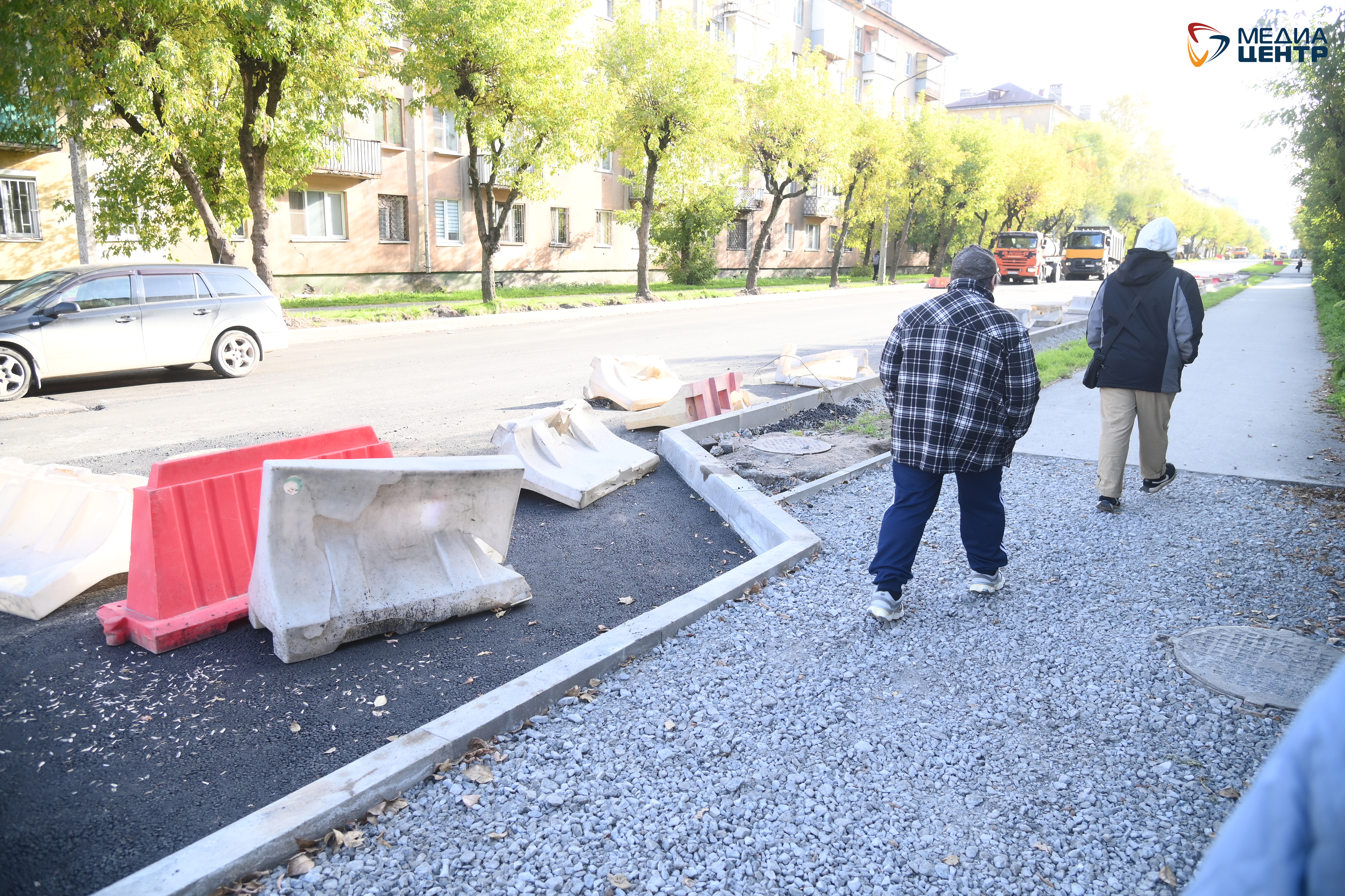 Сейчас подрядчик устанавливает бортовой камень, готовит основания тротуаров от улицы Металлургов до улицы Мира, а также укладывает нижний слой асфальта на участке от проспекта Строителей до Металлургов.