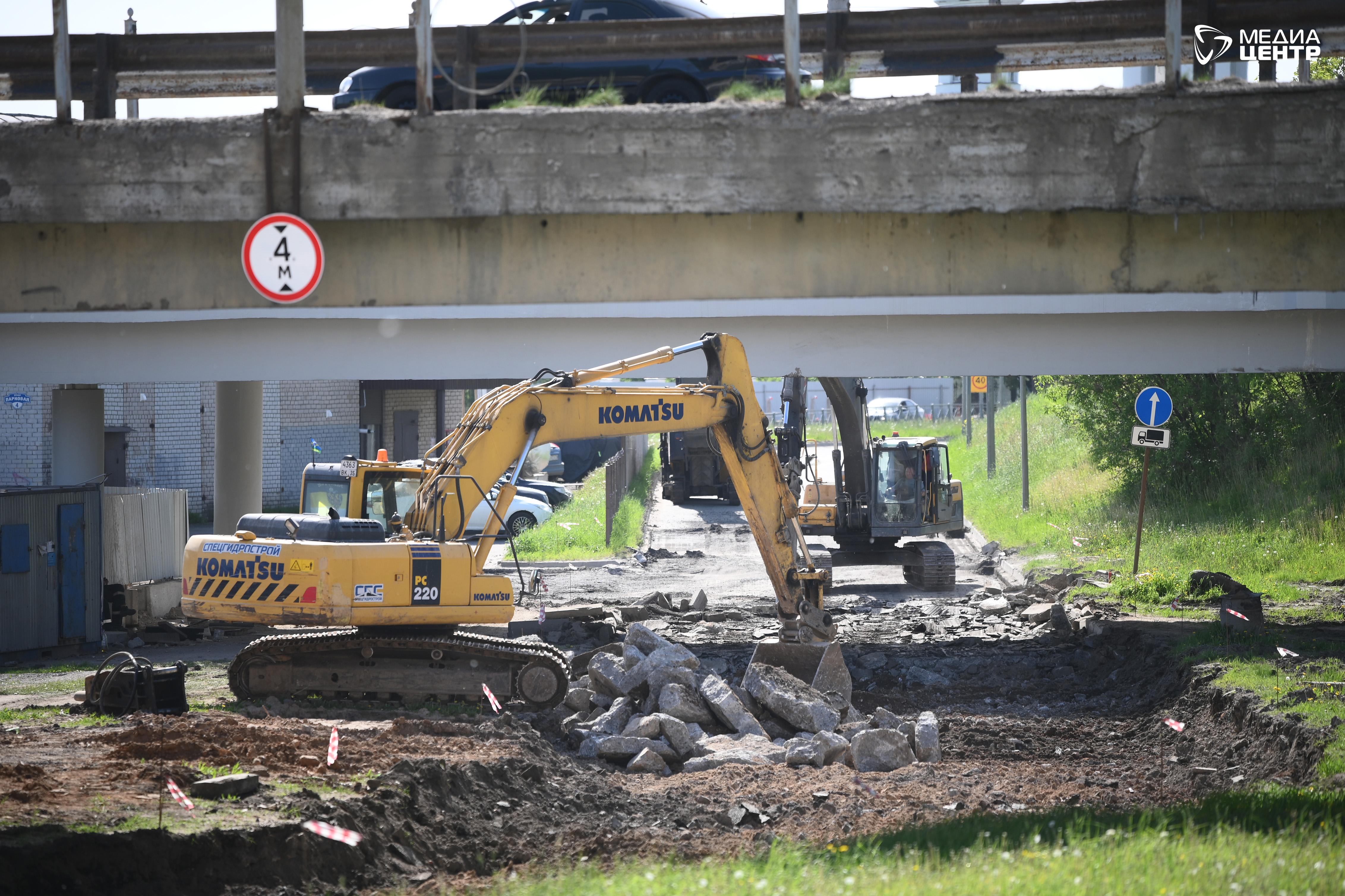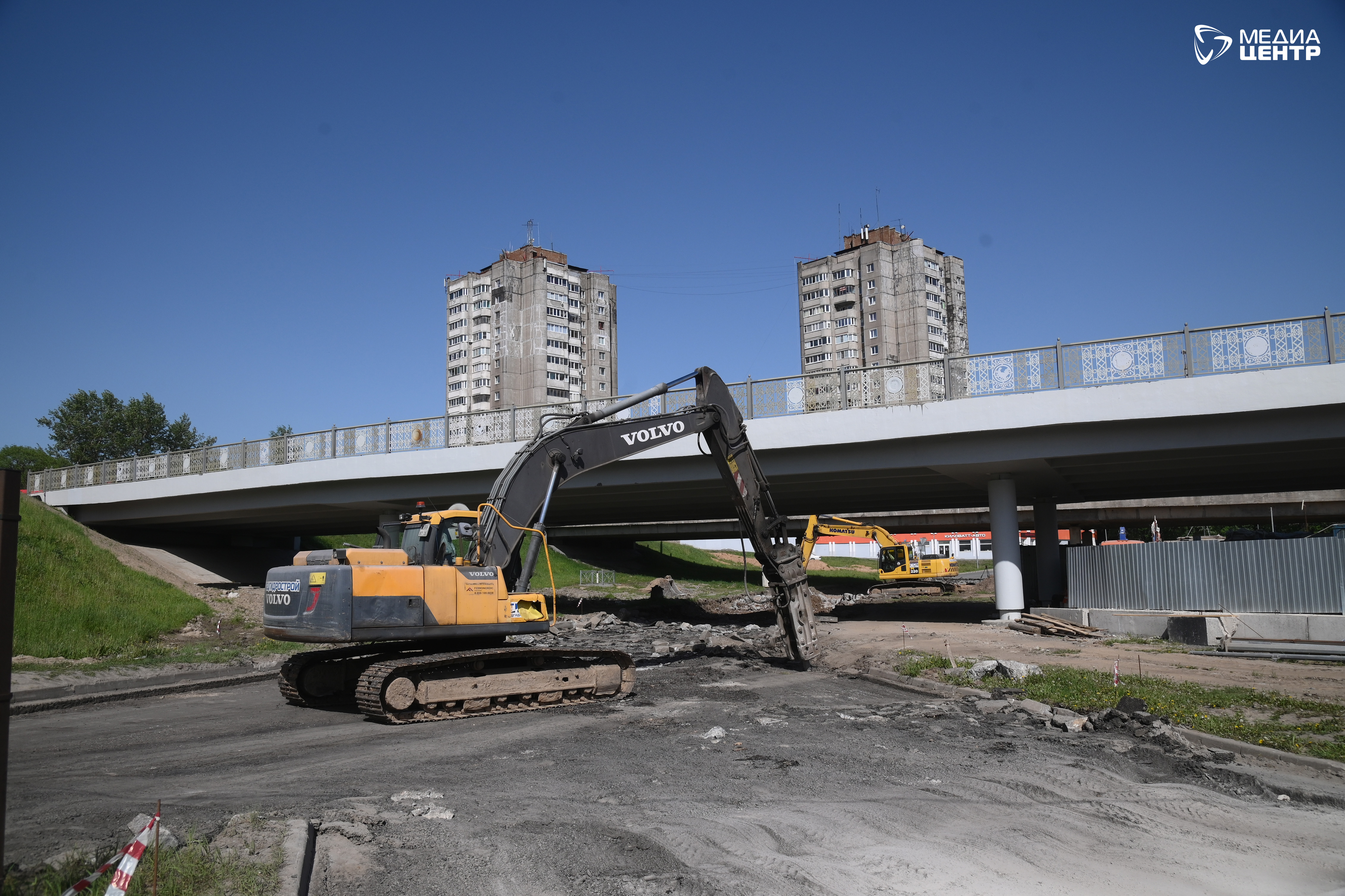Чтобы понизить уровень дорожного полотна, движение на этом отрезке в сторону улицы Парковой пришлось перекрыть. Когда работы завершатся, расстояние от асфальта до эстакады моста увеличится примерно на метр.