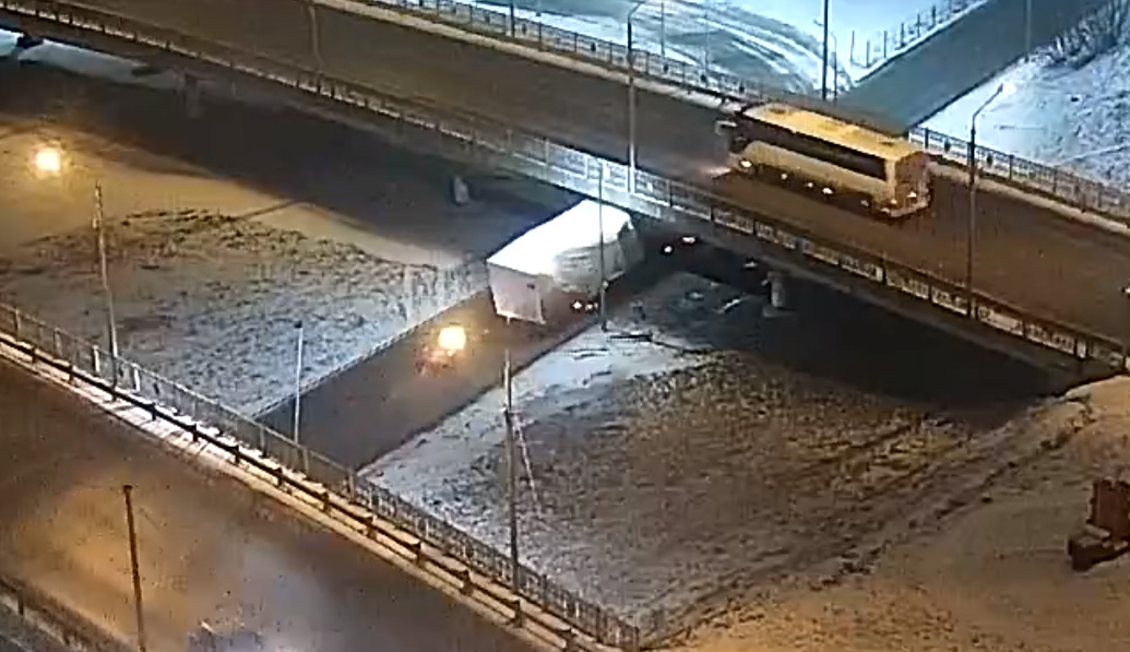 Инцидент зафиксировали камеры видеонаблюдения. На записи было видно, что, врезавшись в железобетонную конструкцию эстакады, задняя часть фуры съехала на дорогу и едва не придавила двигавшийся следом легковой автомобиль. Как сообщала тогда газета «Речь», авария стала причиной крупной пробки.