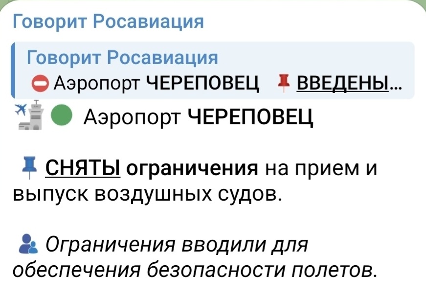 Росавиация сообщила о снятии ограничений на прием и выпуск воздушных судов в аэропорту Череповца в 16:05. Ограничения вводились ночью 25 марта для обеспечения безопасности полетов.