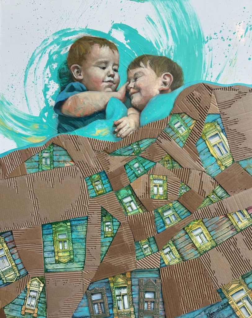 На большом холсте изображены двое сыновей Екатерины: старший улыбается, а малыш внимательно изучает лицо брата. Они укрыты лоскутным одеялом, лоскутки на котором - в виде окошек с наличниками, характерных для Вологодчины, чередующиеся со вставками из картона.