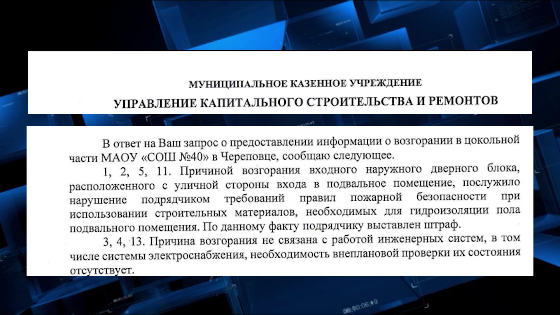 «Причиной возгорания входного наружного дверного блока, расположенного с уличной стороны входа в подвальное помещение, послужило нарушение подрядчиком требований правил пожарной безопасности при использовании строительных материалов, необходимых для гидроизоляции пола подвального помещения. По данному факту подрядчику выставлен штраф. Причина возгорания не связана с работой инженерных систем, в том числе системы электроснабжения, необходимость внеплановой проверки их состояния отсутствует».Подрядчиком по договору проходит ООО «Гранд». В отношении компании был составлен протокол и выставлен штраф. Устранение последствий пожара также проводилось за счет строителей. Поскольку очаг возгорания находился снаружи здания — на уличной стороне входа в подвал — автоматическая система, которая монтируется исключительно во внутренних помещениях, не сработала, отметили власти. Инцидент не повлиял на учебный процесс.