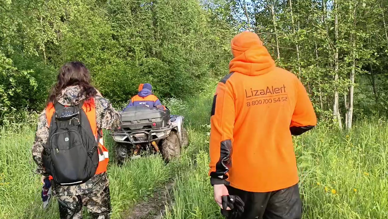 Наконец поисковики сообщают, что привели пропавшую на точку к спасателям и родственникам. Спасатели подъехали туда на квадроциклах.