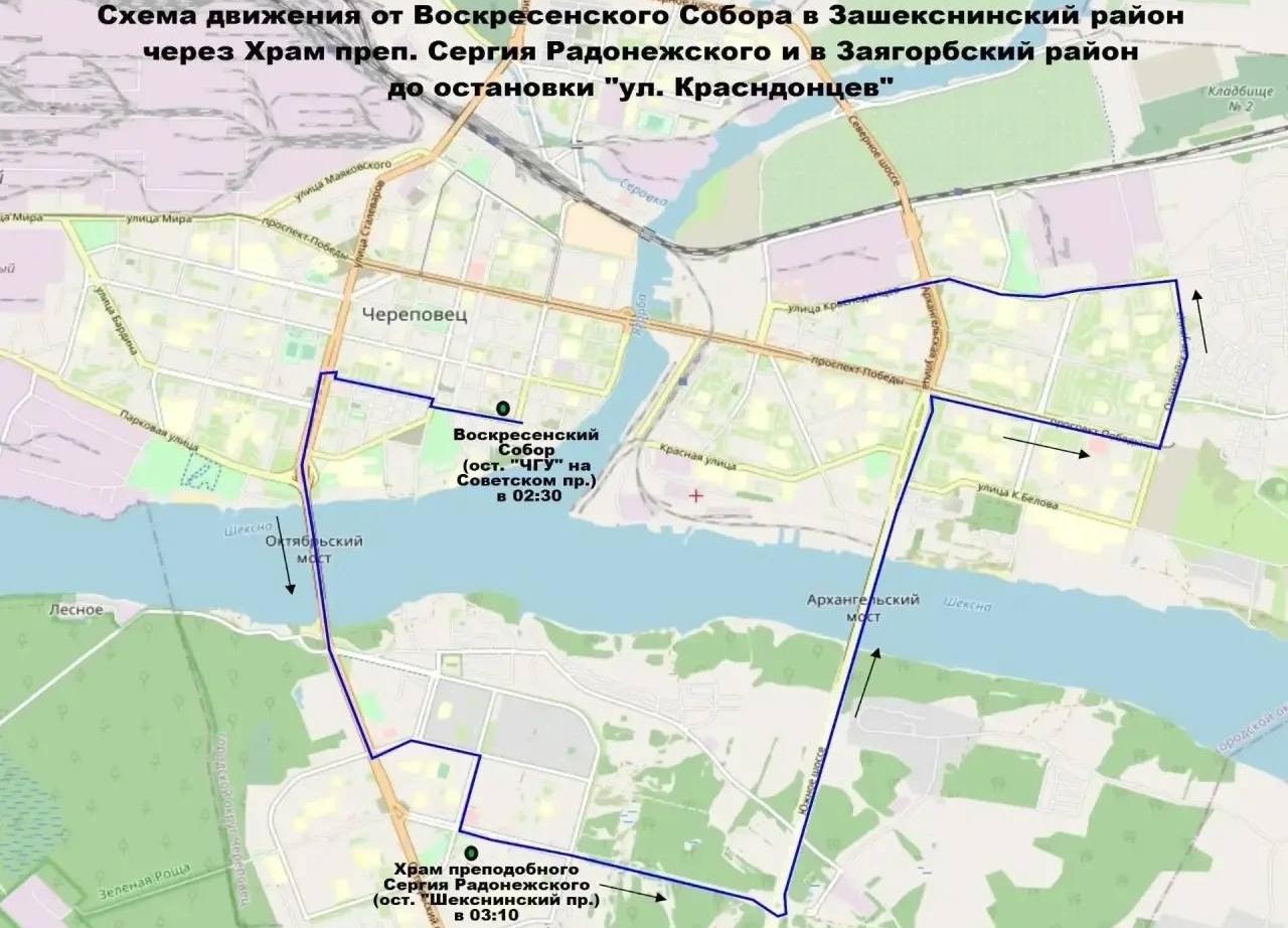 - от кафедрального собора Афанасия и Феодосия Череповецких — в Индустриальный и Северный районы;