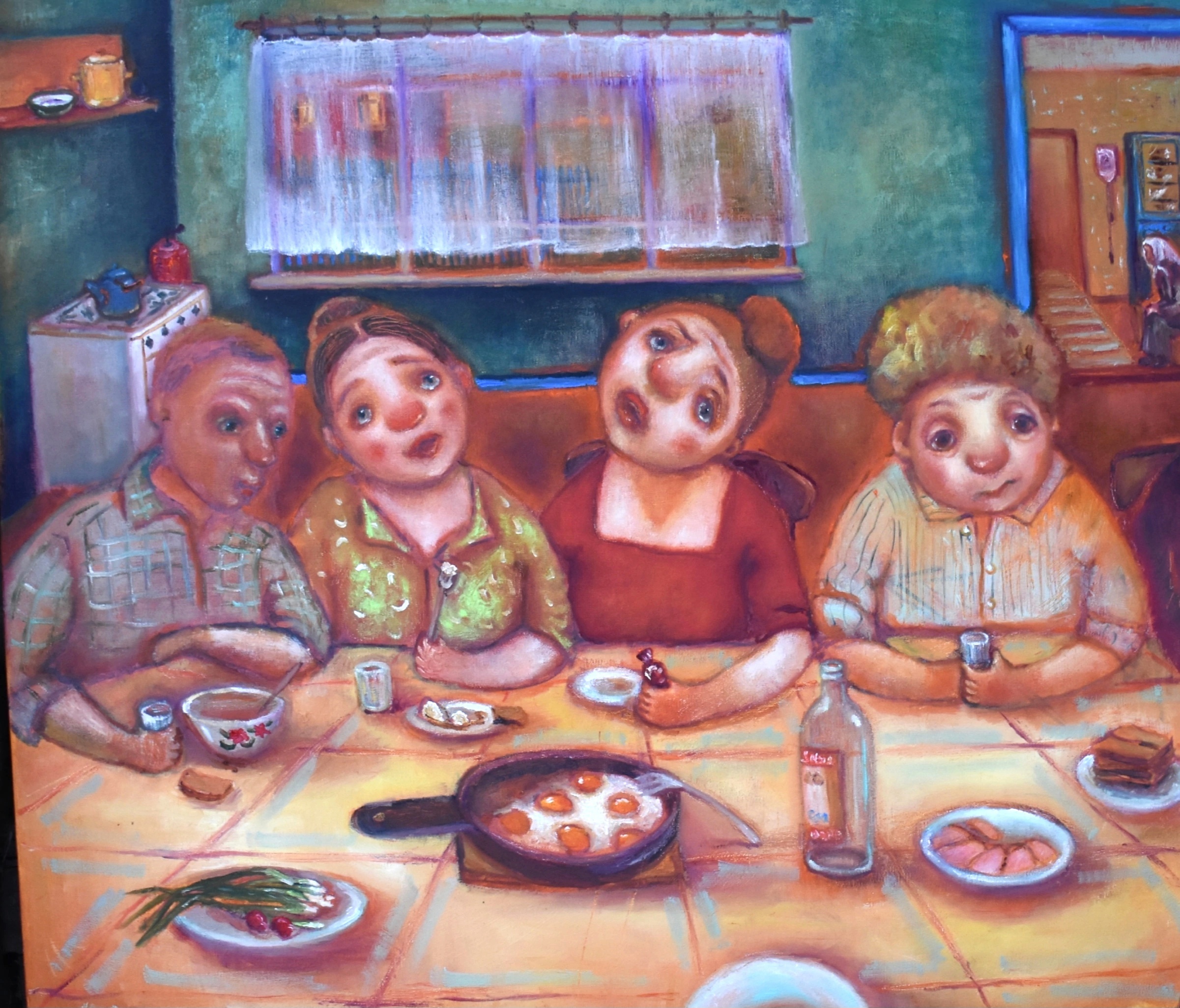 - Эта картина — воспоминание о детстве в Белоруссии 70-х годов. Все соседи жили в годы войны, пережили оккупацию, многие побывали в концлагерях. Летом на бабушкиной веранде собиралась вся улица. Начинали с разговоров, смеха, застолья, но вечер неизменно переходил в воспоминания о войне. Мужчины становились задумчивыми, женщины плакали, пели песни. Бабушка уходила в свою комнату, а я, ребёнок, слушала и понимала, как важно мирное небо. Даже спустя десятилетия, война продолжала определять, о чём говорят люди, какие песни звучат за столом, какие моменты остаются в памяти. Название картины взято из песни «За того парня». Она отражала настроения и часто пелась на застольях, - делится художница с сайтом «35медиа».