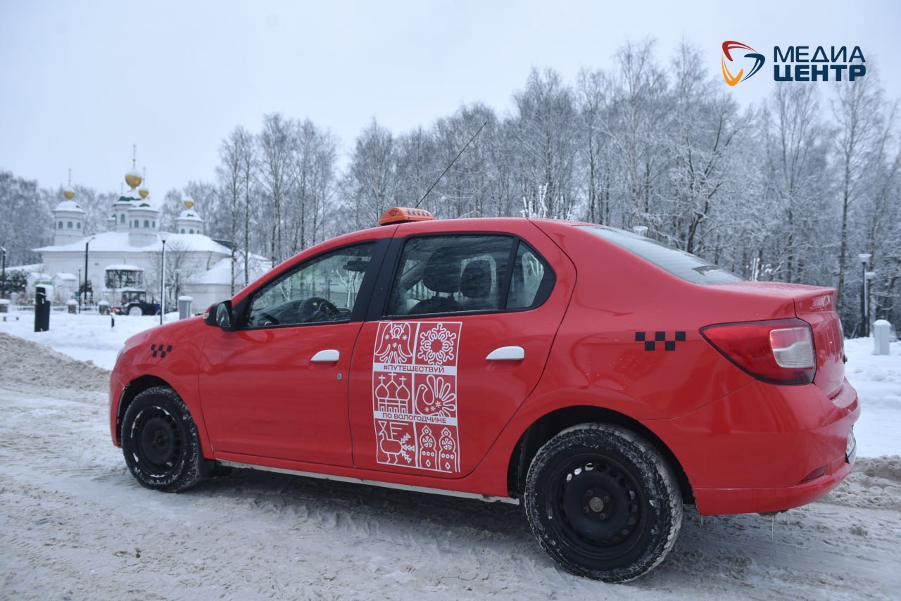 В конце 2025 года сначала в Вологде, а затем и в Череповце появились машины такси красного цвета с фразой «Путешествуй по Вологодчине».