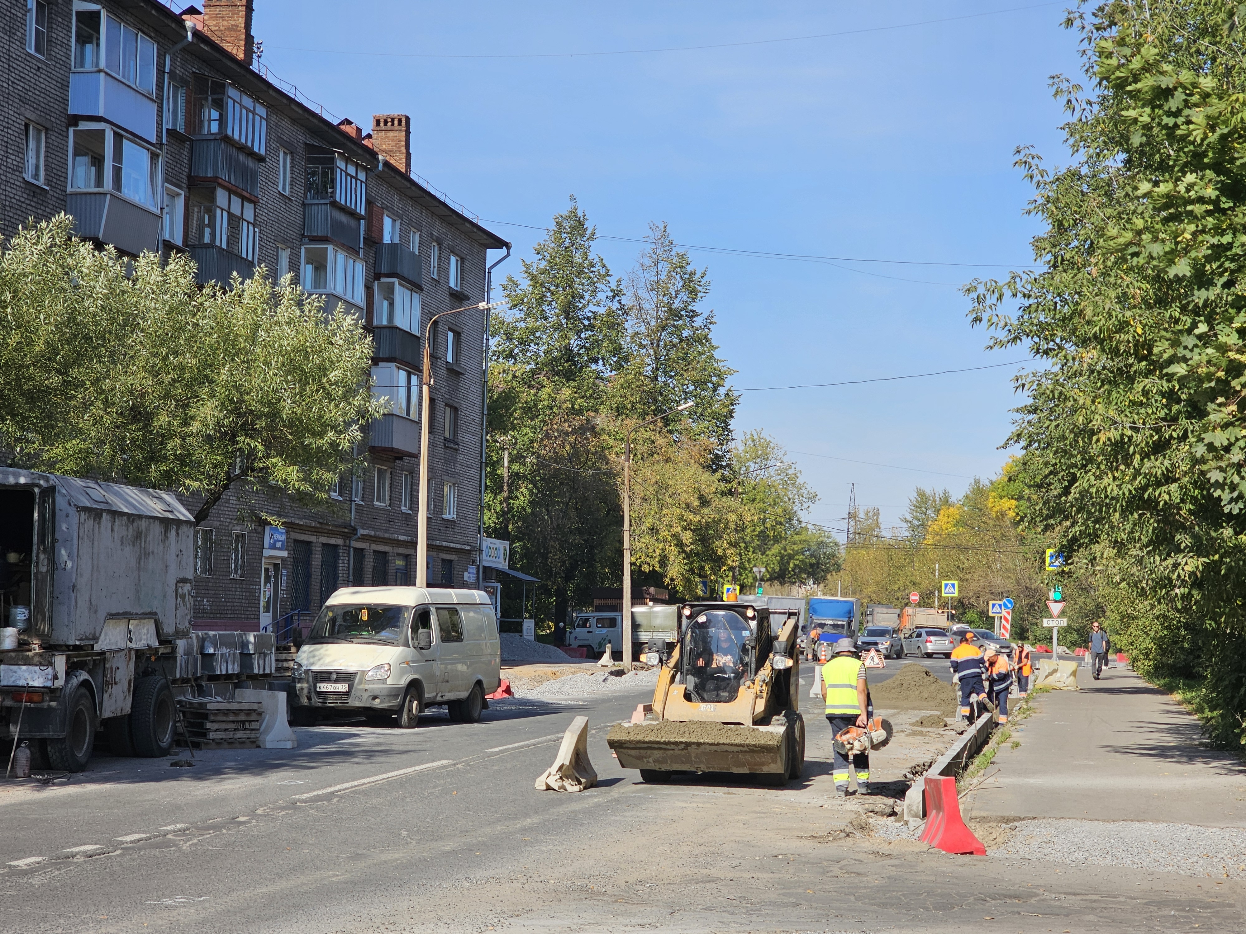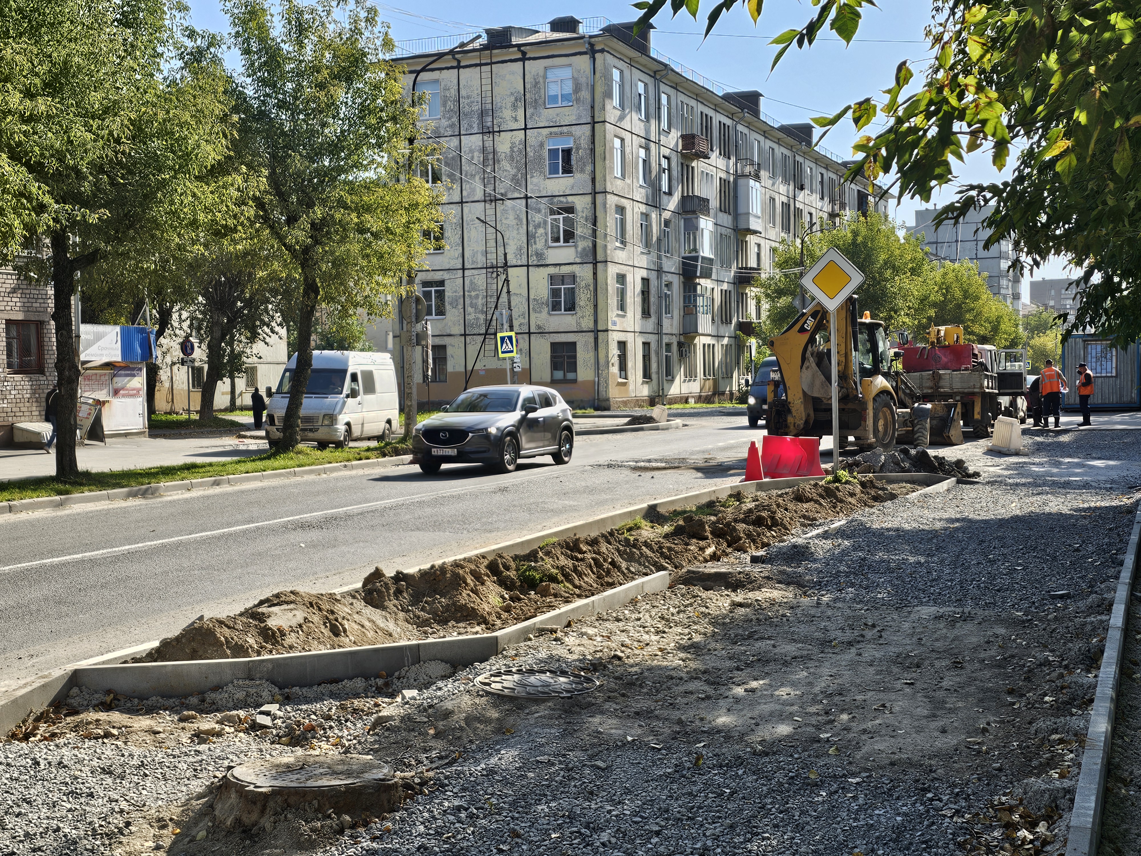 Напомним, отрезок для ремонта дороги разделили на три части, хотя работы параллельно идут на каждом из них. Бригады начали с участка от проспекта Строителей до улицы Ленина, сейчас здесь работы в разгаре, на 70% выполнены тротуары, одновременно с дорожниками трудятся и теплоэнергетики. Уже начались демонтажные работы на участке от Ленина до Металлургов. Здесь снимают бордюрный камень.