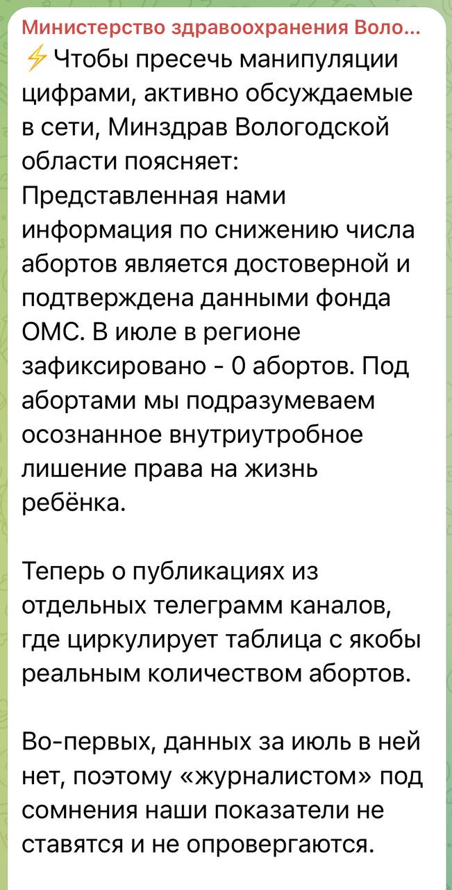 Итак, подведем черту. Данные за полгода по абортам в Вологодской области от фонда ОМС - достоверны. И чиновники здравоохранения это подтвердили. Цифры за июль пока нет, так как запрос в ФОМС был сделан еще в начале прошлого месяца поданным за полугодие. Позднее получим свежие данные, даже не сомневайтесь. И за июль, и за август, и по итогам года. Депутатские запросы уже готовятся. В том числе в адрес вологодского «минздрава». Отвечайте только своевременно, чтобы прокурор на планерках разнос не устраивал.