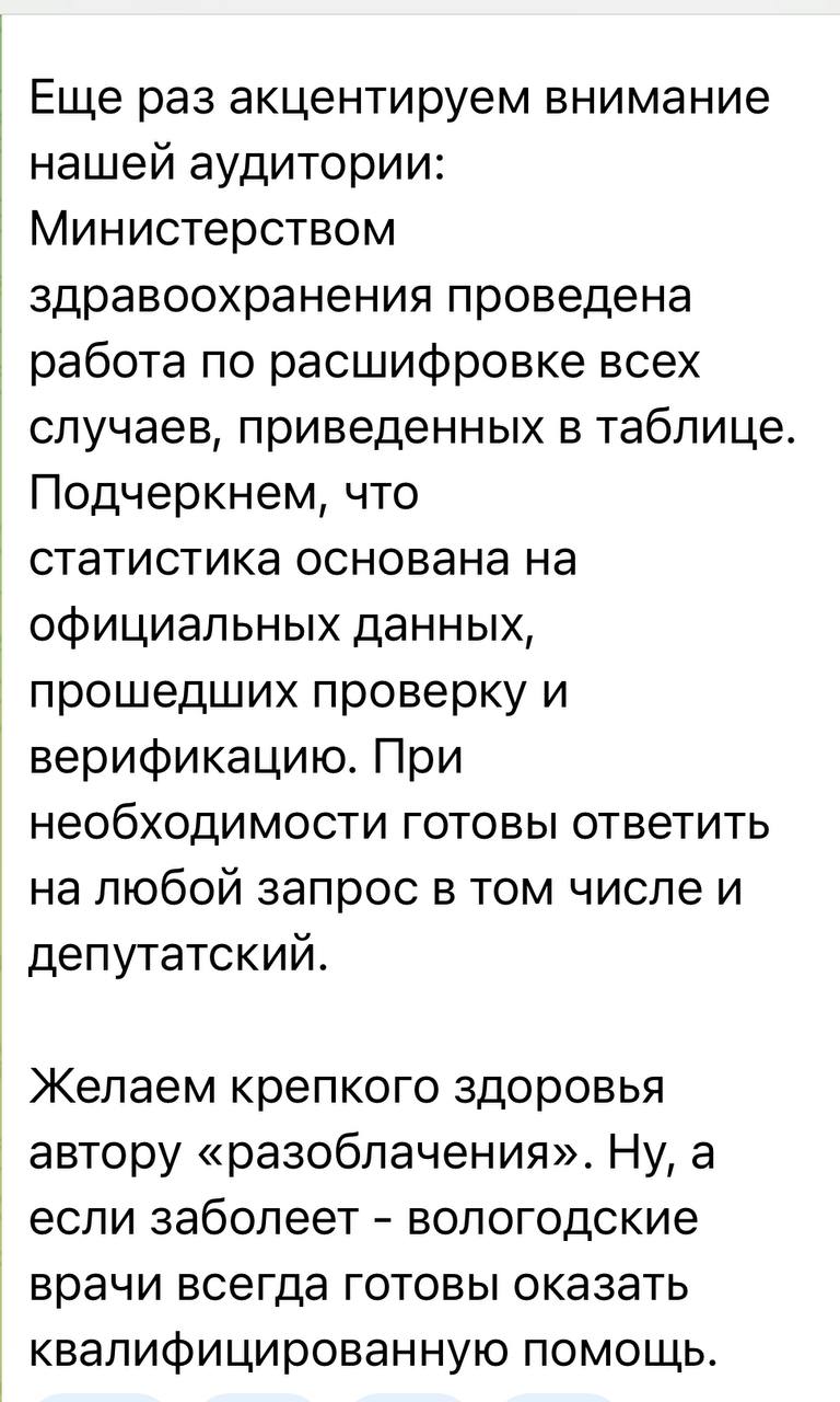 Вывод: победными реляциями в очередной раз «минздрав» области выставил в дураках на всю Россию Вологодскую область. Но это малая часть проблемы. БОльшая - в том, что от попытки решить проблему не через реальную работу, а через красивый отчет страдают все жители региона. Которые прямо говорят - болеть теперь на Вологодчине страшно. Страшно и опасно для жизни. И проблема не в работе медиков, а в качестве управления сферой здравоохранения».