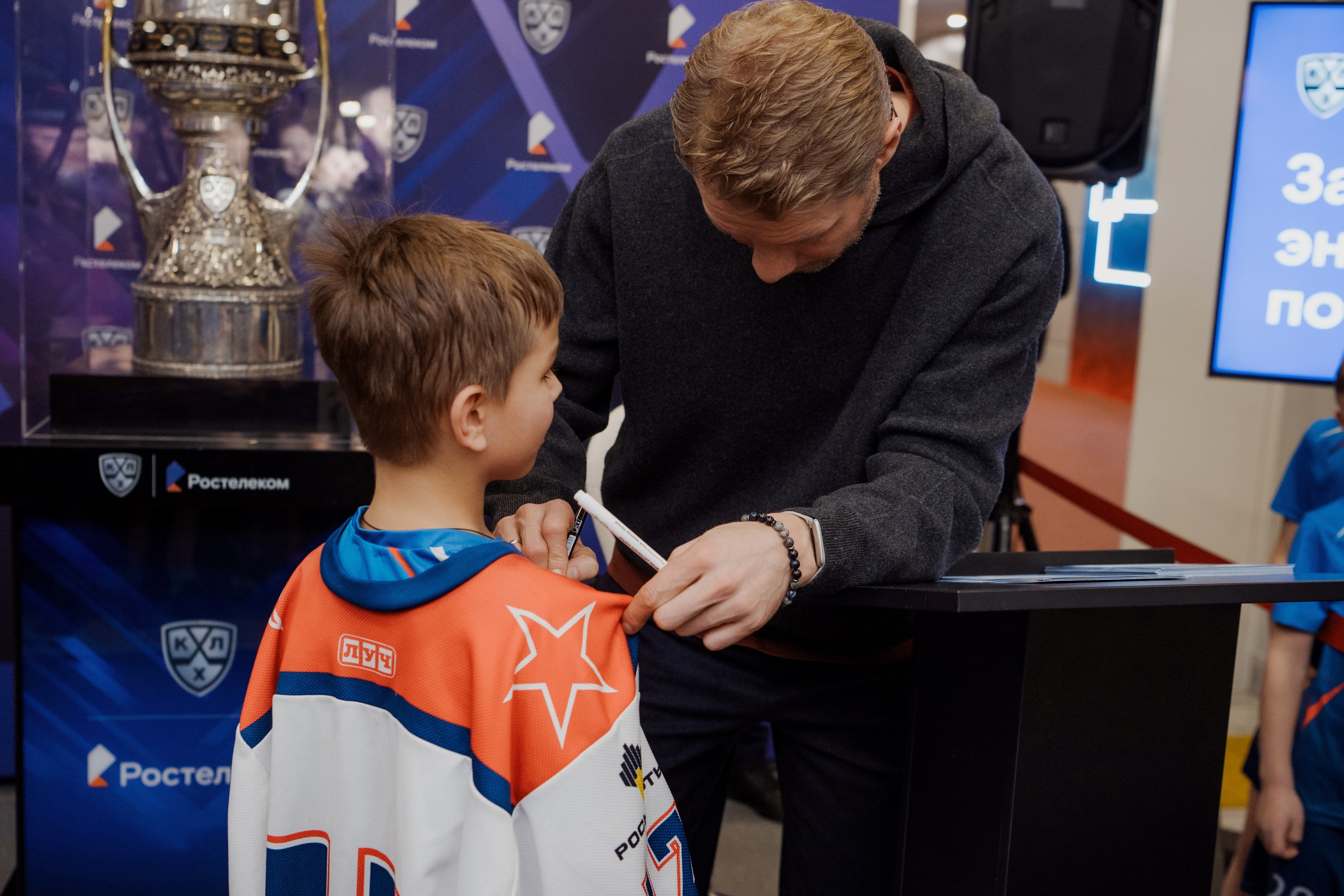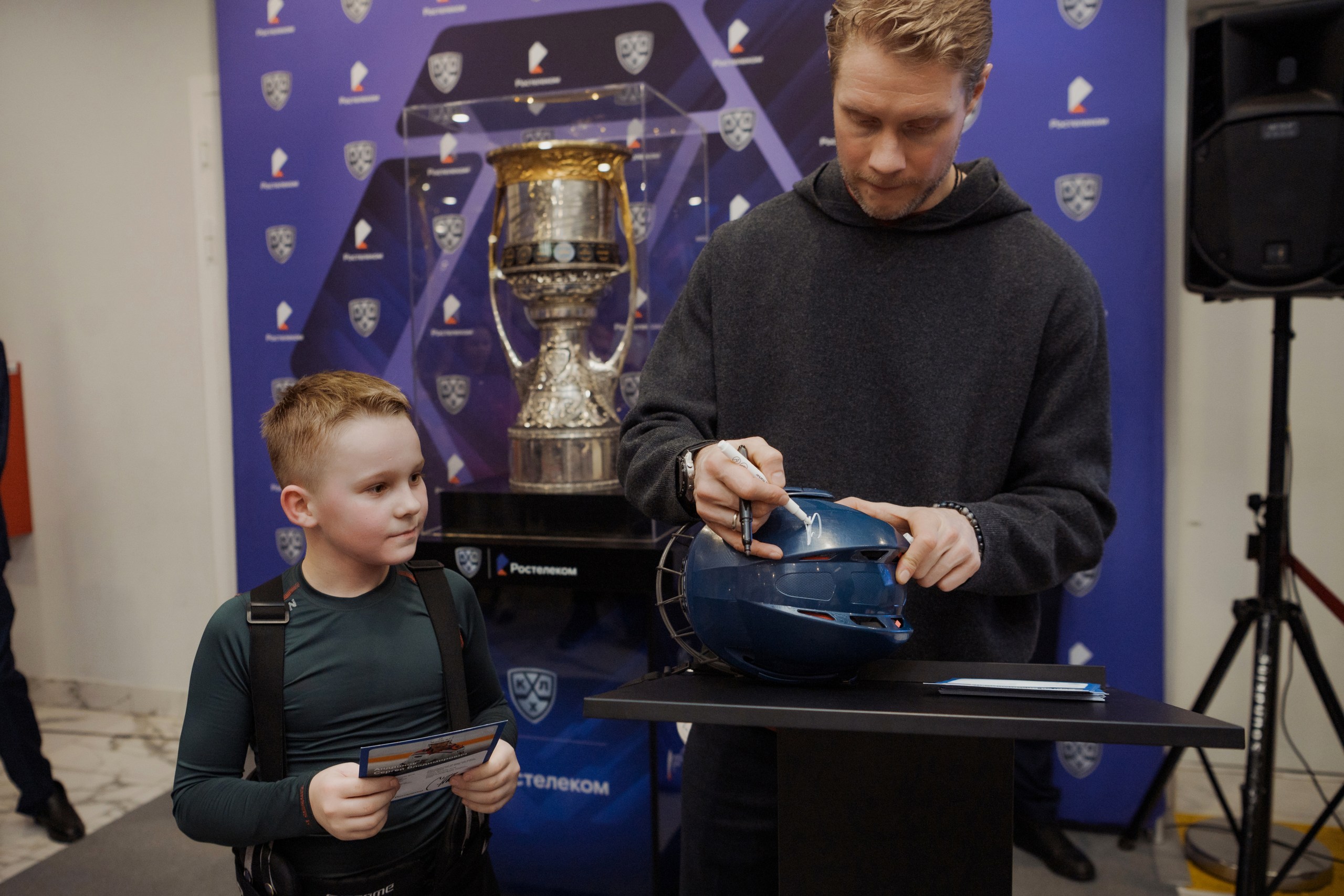 В рамках экспонирования олимпийский чемпион и двукратный обладатель Кубка Гагарина Сергей Андронов оставил свои автографы на 450 картах и хоккейных атрибутах, включая шайбы, шарфы, шлемы и щитки.