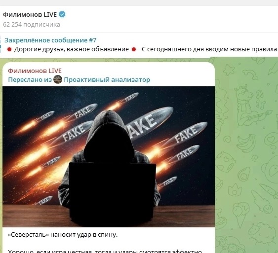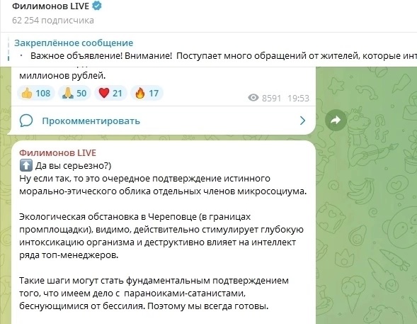 «Компания «Северсталь» выражает возмущение и категорически отвергает ложные и клеветнические утверждения, содержащиеся в публикации Telegram-канала «Проактивный анализатор», которую разместил в своем официальном Telegram-аккаунте, сопроводив оскорбительными комментариями, губернатор Вологодской области Георгий Филимонов.