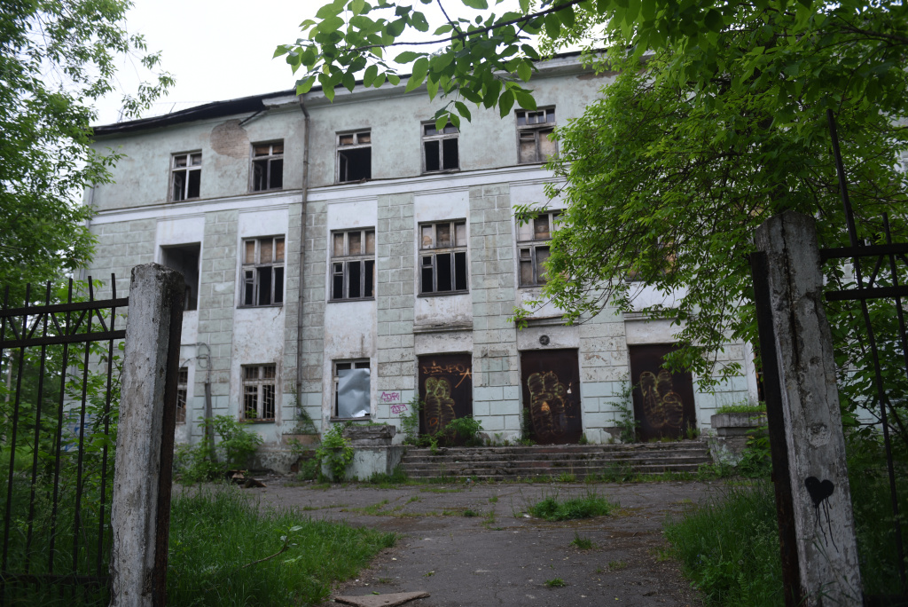 Картина действительно удручающая. Попасть на заброшенную территорию училища не составляет никакого труда. Можно зайти хоть через центральный вход ограды (ворот здесь попросту нет), хоть через боковой. Вот только зачем? Признаки того, что это место давно покинуто, видны издалека. Стекла в оконных проемах отсутствуют, где-то их роль выполняют железные листы, где-то – остатки деревянных плит. Впрочем, и тех и других совсем немного.