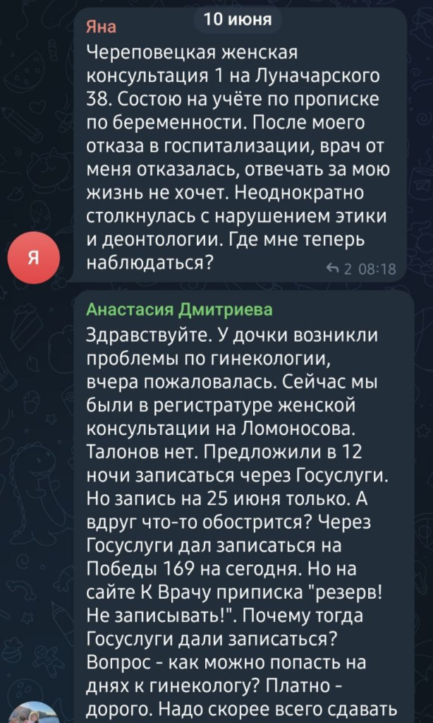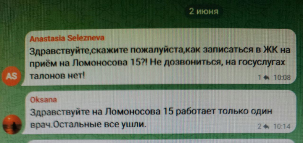 Например, Анастасия Д. спрашивает: «Возникли проблемы по гинекологии. Лично обратились в регистратуру ЖК на Ломоносова. Талонов нет. Предложили в 12 ночи записаться через "Госуслуги". Но запись на 25 июня только. А вдруг что-то обострится? Как можно попасть к гинекологу быстрее? Платно — дорого».