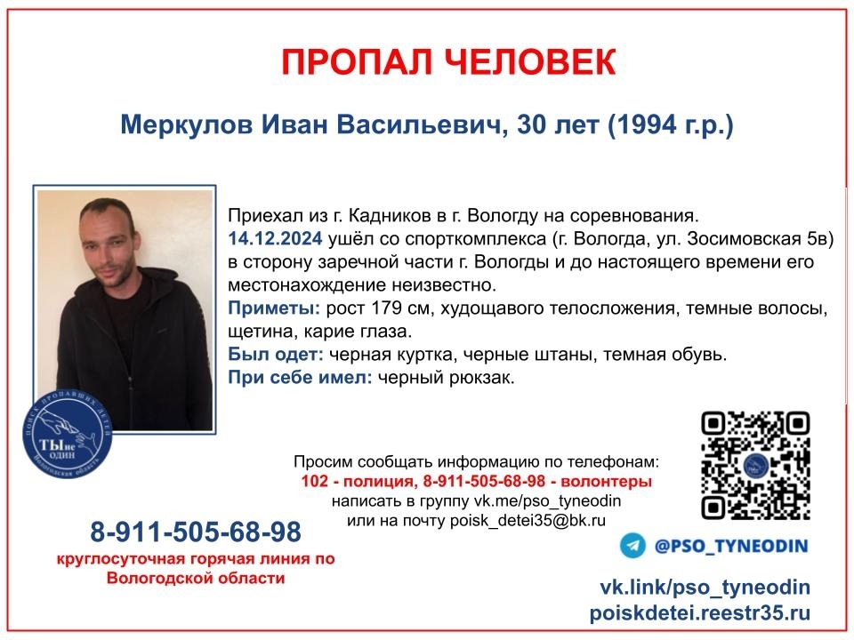 По информации из ориентировки поисково-спасательного отряда «Ты не один», 30-летний житель г. Кадникова приехал на соревнования в Вологду.