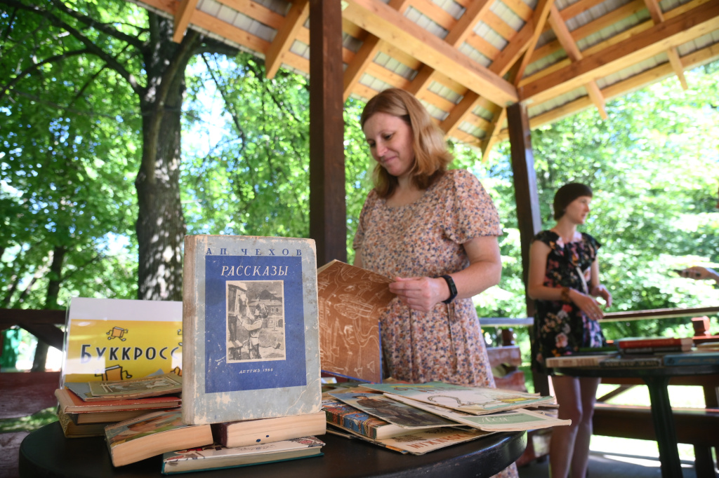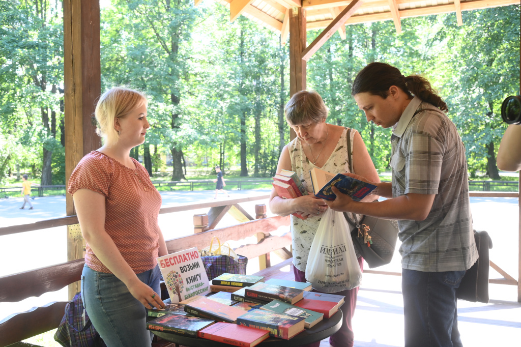 День выдался солнечный, книжные развалы расположились под деревянной крышей просторной парковой беседки. Столы с книгами мгновенно обступили горожане разных возрастов. Смысл акции нам объяснили сотрудники центральной городской библиотеки им. В. В. Верещагина.