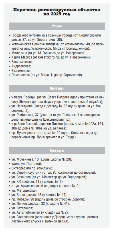 В прошлом году, напомним, в Череповце по нацпроекту обновили семь улиц: Курсантский бульвар от Набережной до Советского, улицы Ленинградскую, Маяковского, Устюженскую от Парковой до Стройиндустрии, Остинскую от Молодежной до Окинина, Окружную, Раахе от Октябрьского до Годовикова.