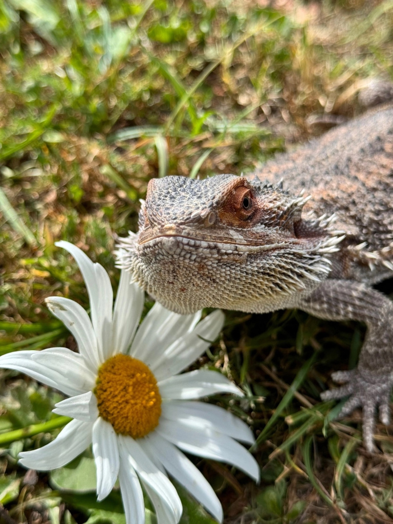 — Мы выпускаем ее периодически, так сказать, размять лапки, — говорит Дмитрий. — Гуляет строго под присмотром, контактирование с другими животными во избежание травм лучше исключить. Коты и собаки очень живо реагируют и хотят потрогать лапами. Агама, конечно же, от них убегает, они ей неинтересны. Во время прогулок она залезает на цветы, в коробки или же просто ложится спать. В летние месяцы выгуливаем ее около дома, тоже обязательно под присмотром.