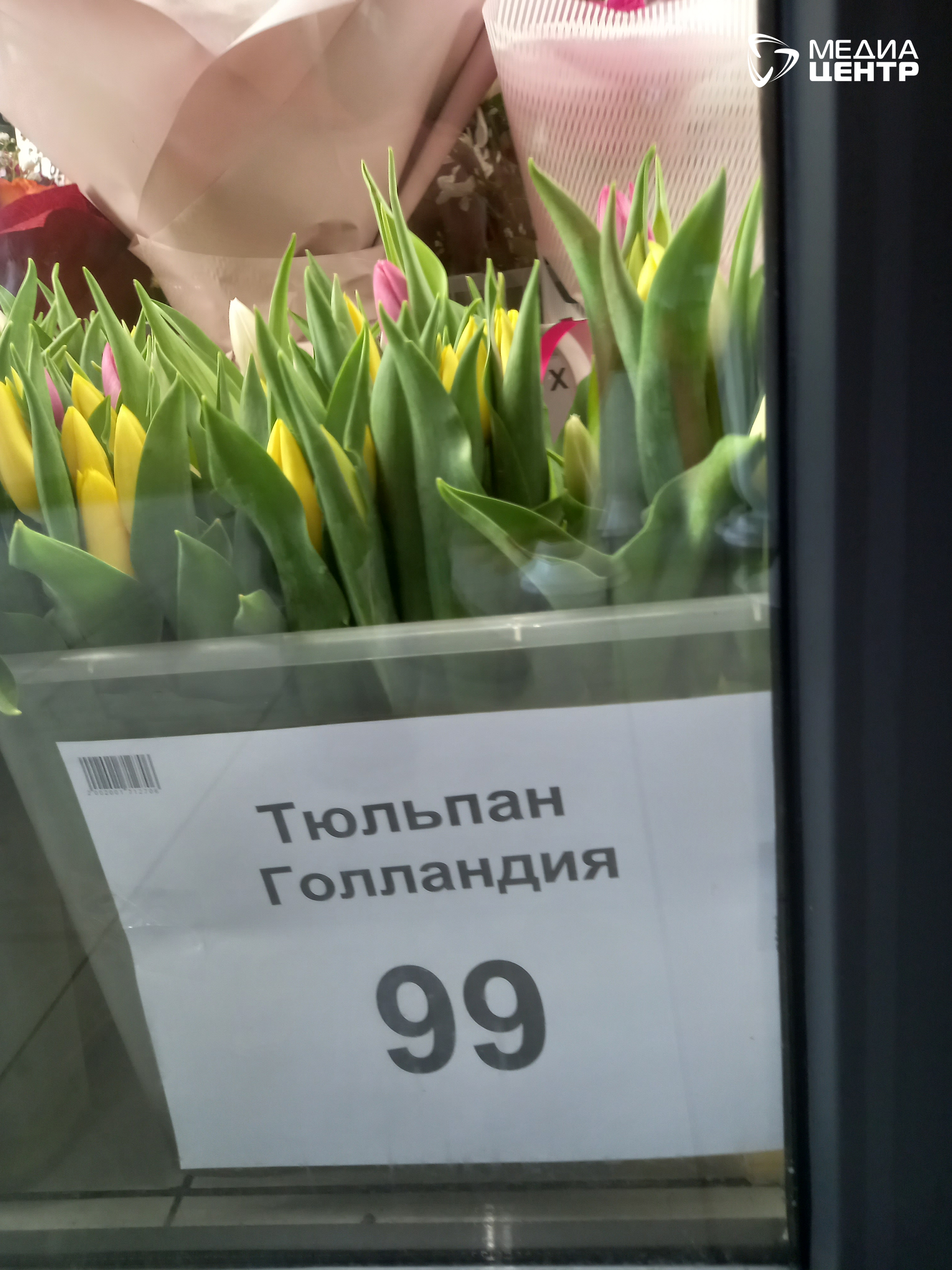 Заходим в ТЦ «Макси» на улице Сталеваров. В шкафу-холодильнике только тюльпаны — желтые, сиреневые, малиновые. Монобукет: 5 штук — 399,9 рубля, 15 штук — 1199 рублей, 25 штук — 1999 рублей. Считаем — один тюльпан стоит 80 рублей. Спросили у сотрудника торгового центра, откуда тюльпаны. Тоншаловские, ответили нам.