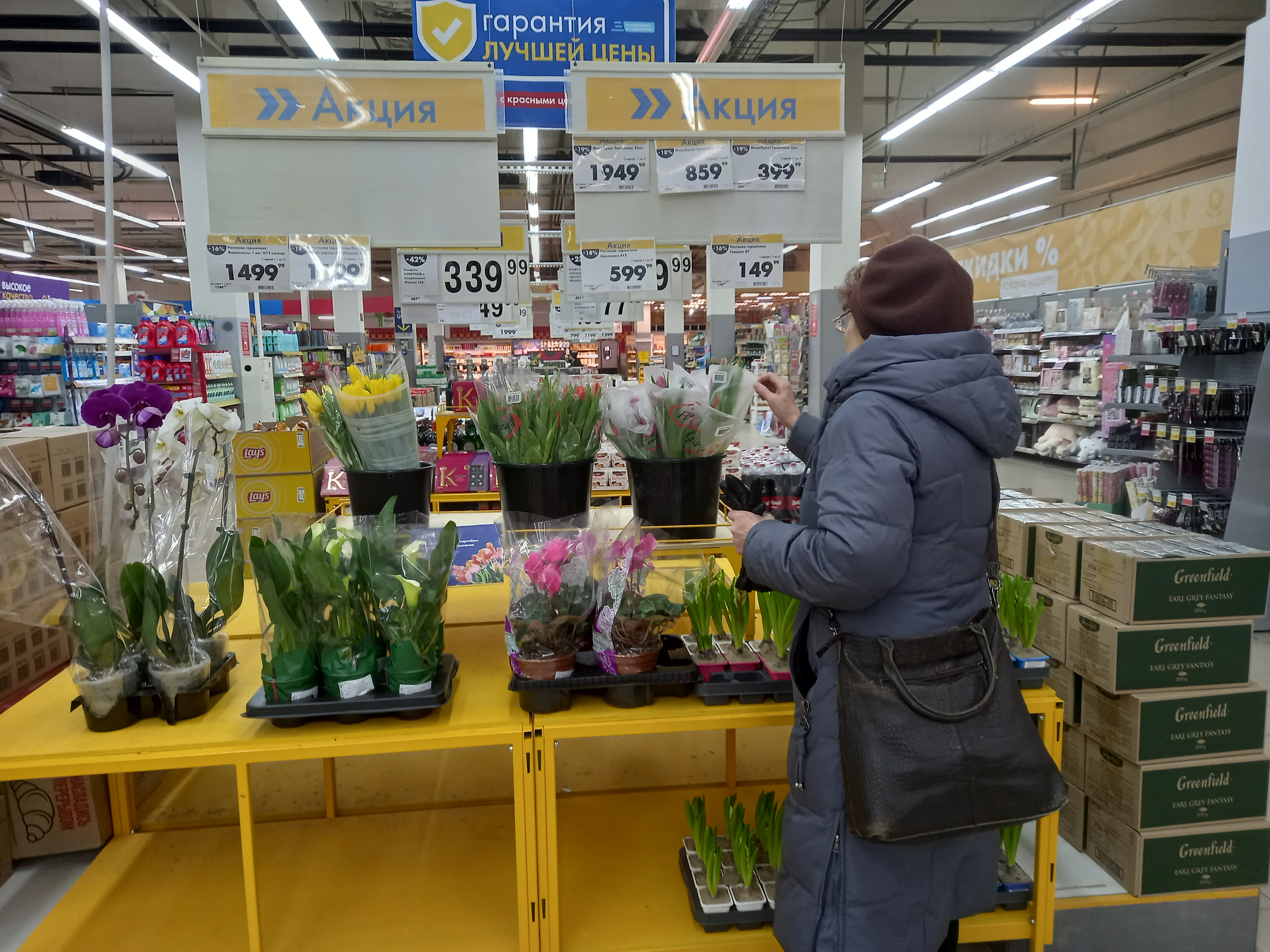 Мы побывали в Индустриальной части города, теперь едем за Шексну, в ТЦ «Июнь». Здесь в гипермаркете на первом этаже на полках дожидаются своего покупателя тюльпаны из Армении: 5 штук — 399,9 рубля, 11 штук — 859,9 рубля, 25 штук — 1949 рублей. Цена одного армянского тюльпана — 80 рублей, как и тоншаловского.