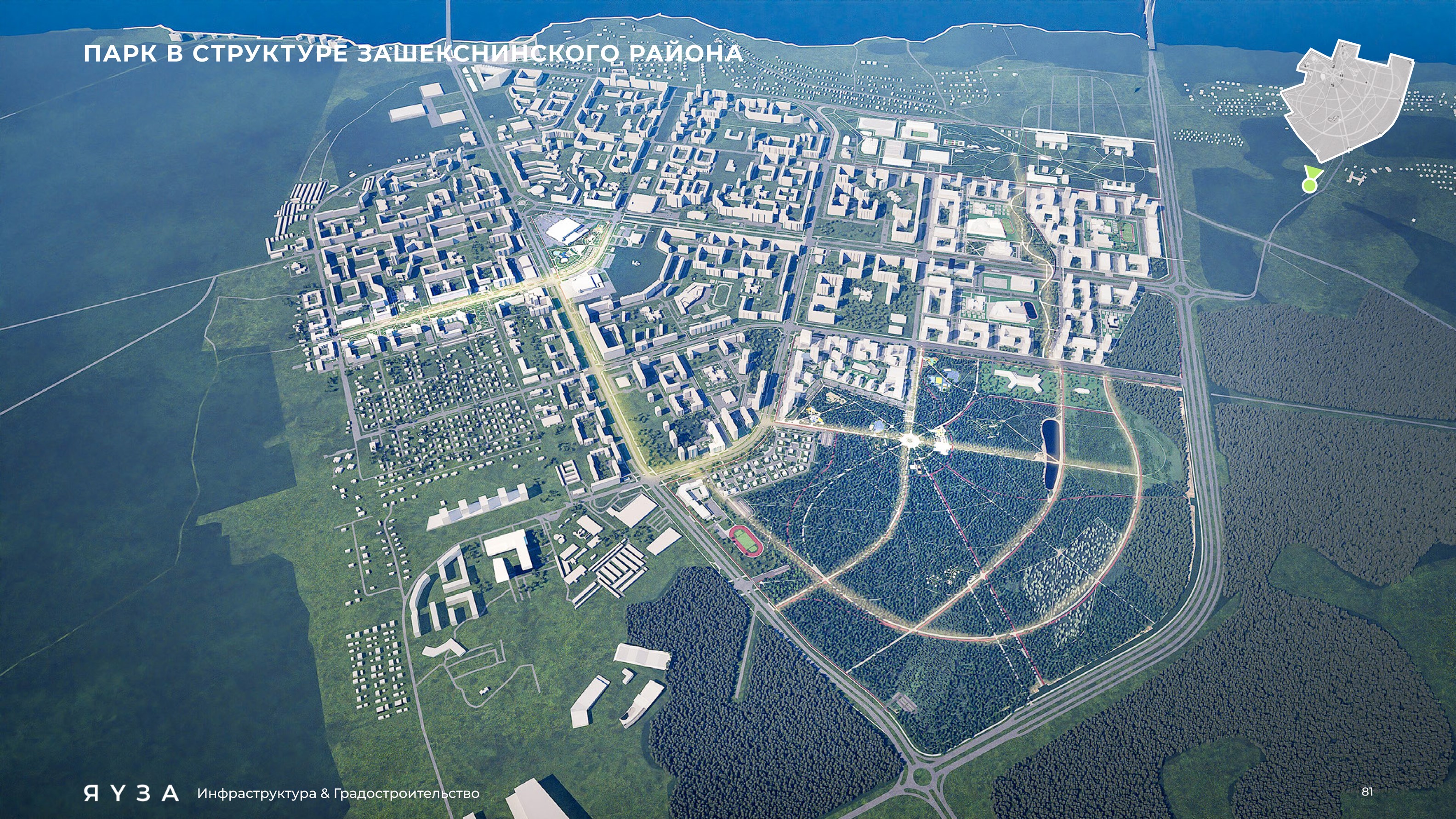 Отмечается, что участок находится в месте перспективного развития Зашекснинского района. В будущем вокруг него будут построены новые жилые микрорайоны с сопутствующей инфраструктурой. Пока же основная социальная инфраструктура сконцентрирована в соседних 144-м и 161-м микрорайонах. Там находятся детские сады № 17 и 9, большой супермаркет, магазины. Проект предусматривает создание многофункционального лесопарка, состоящего из двух зон: активной (она же — первая очередь) с наибольшей концентрацией мест досуга и природной — где территория сохранена в близком к первозданному виде. На территорию можно будет попасть через 12 оборудованных арками и навигацией входов. Из них шесть — пешеходные, а другие позволят въезжать и спецтехнике.