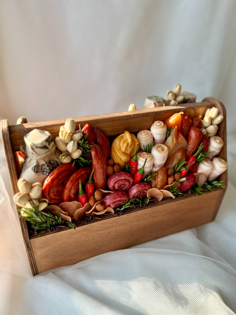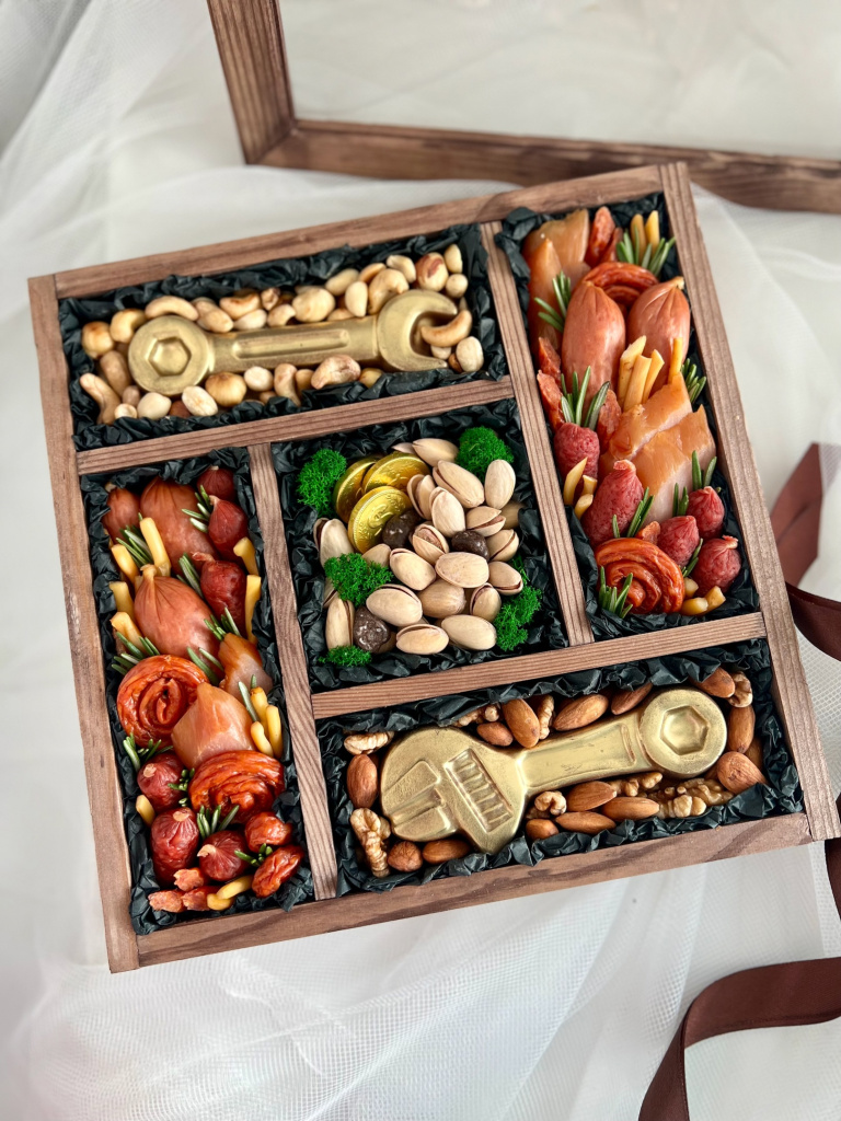 - В состав такого букета входят копченые, сыровяленые колбасы, сыры, орешки. Спортсменам и ЗОЖникам заказывают композиции из сухофруктов, орехов, а в центре – бутылку «Боржоми» или коробку сока, кто-то выбирает для мужчин безалкогольное пиво, а кто – и что покрепче, - продолжает Александра Садкова. – Есть и новинки, так, мы сейчас делаем букет в виде гамбургера на ножке или в прозрачной коробке-тубусе.