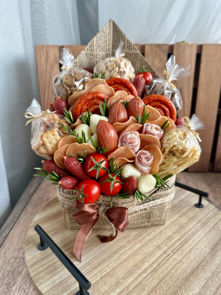 Вернемся к мужским букетам. В подарок сильной половине человечества можно заказать не только сладкий, но солено-копченый букет.