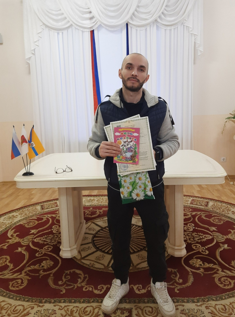 Папе двойняшек вручили первые документы дочерей — свидетельства о рождении. Фото: отдел ЗАГС г. Череповца.