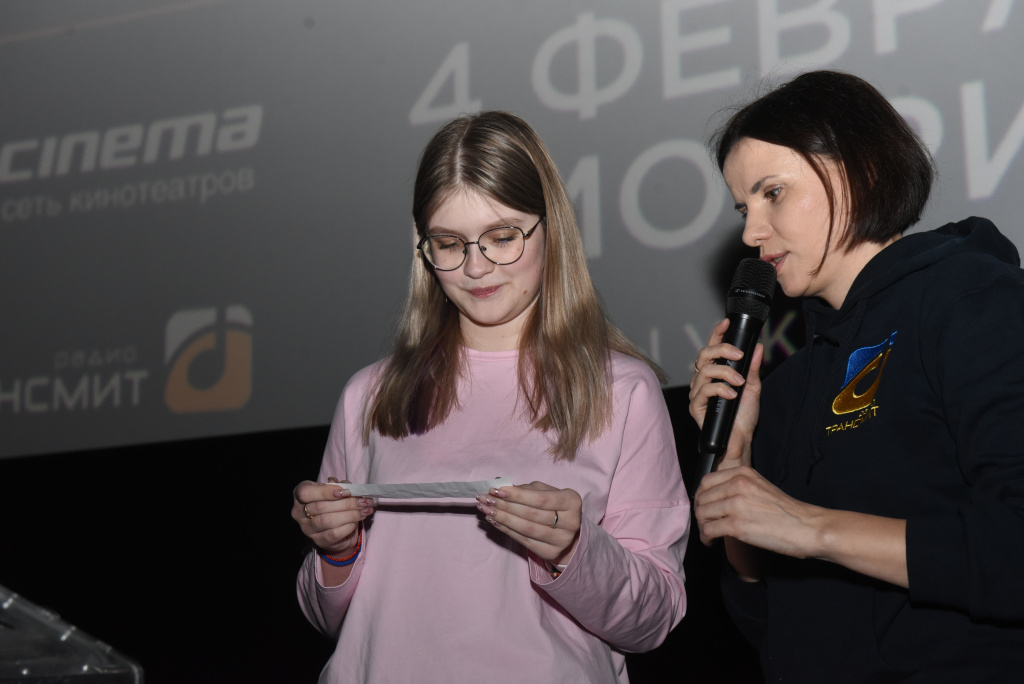 Перед показом в «MORI CINEMA» главный редактор «Трансмита» Наталья Ким провела беспроигрышную лотерею. Каждый желающий мог покрутить лототрон, ответить на вопрос и получить подарок: сертификат на пиццу, пригласительный билет в кино и т.д.