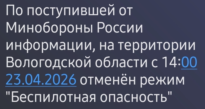 - В связи с поступившей информацией (по словам очевидцев, на границе Ярославской и Вологодской областей обнаружены БПЛА) принято решение о запуске системы оповещения. Для информирования жителей Череповца об угрозе атаки будет задействовано СМС-информирование, а также включены сирены.Впервые в школах и детсадах Череповца родителей просят оставить детей дома до отмены режима «Беспилотная опасность», однако занятия не отменены. Уведомления об этом рассылают классные руководители в школьных чатах.