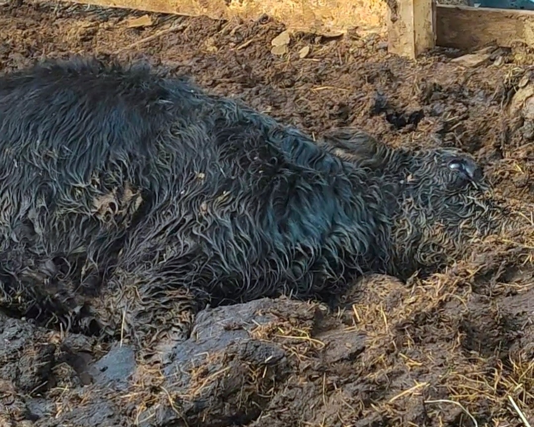 Два трупа молодых бычков лежали в грязи. Рядом находились двое живых животных. Но ни еды, ни воды поблизости не было.