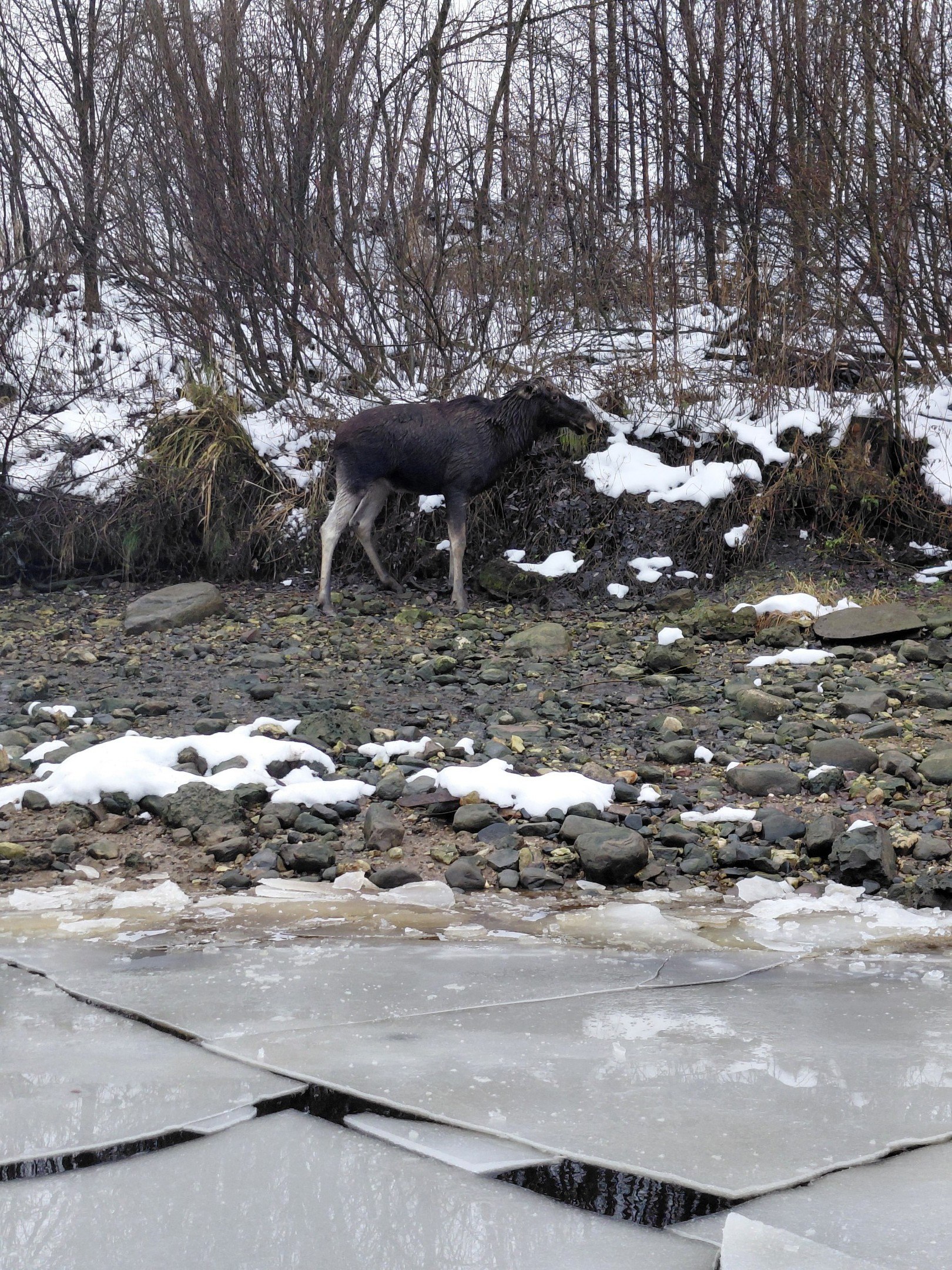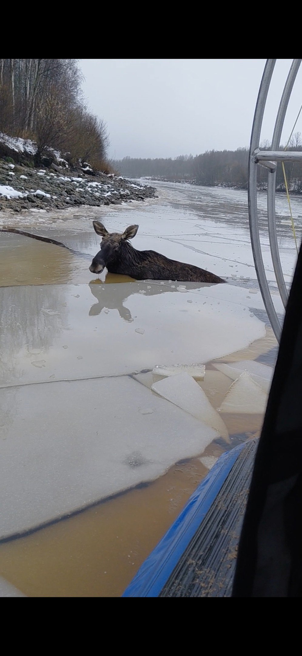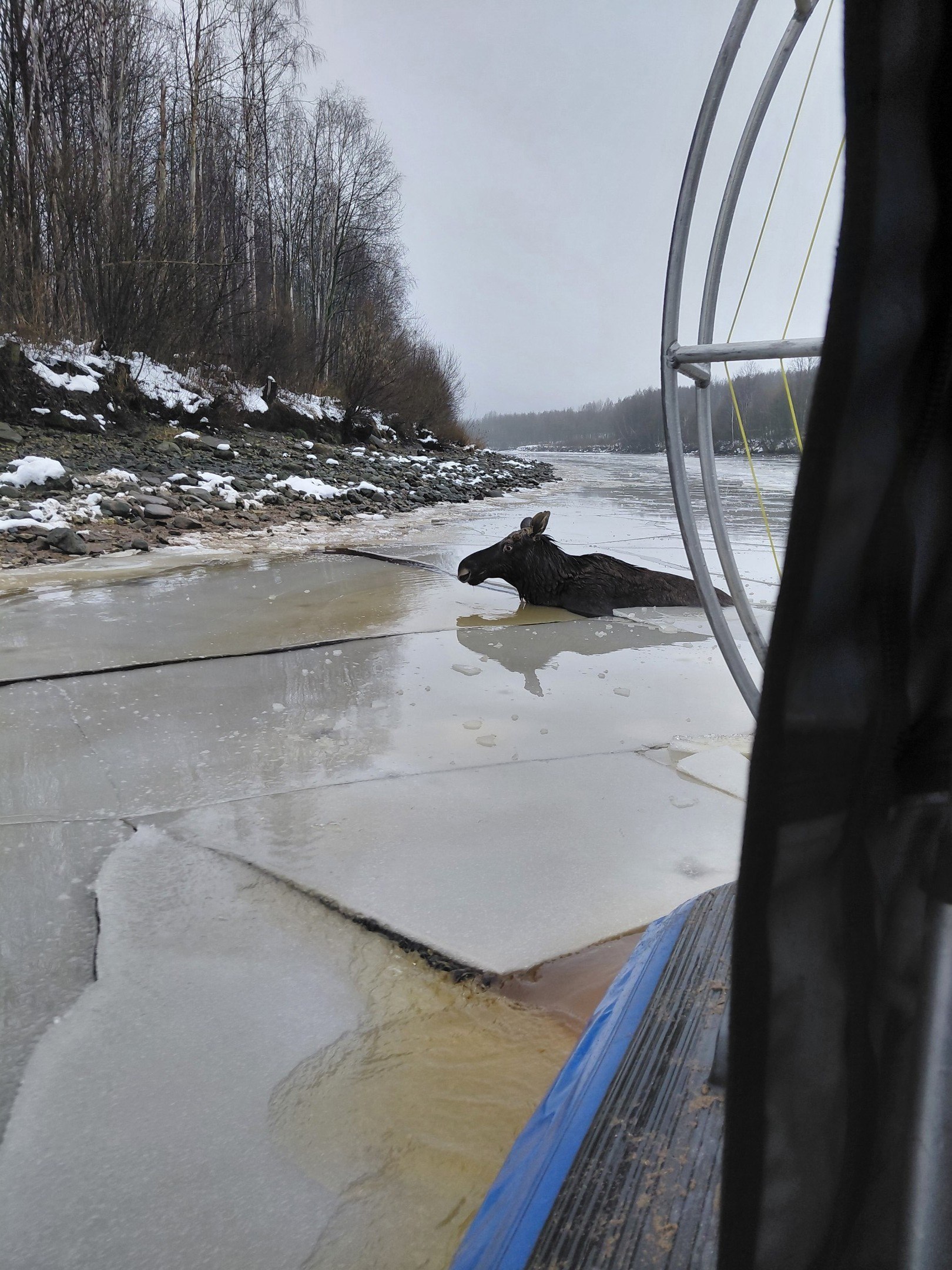 Сохатый провалился под лёд в районе острова Соляной. В воде он оказался, убегая от собак, и сам выбраться не смог.