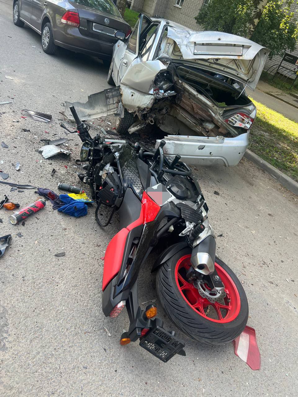 По предварительной информации, водитель на «Киа Рио», не уступил дорогу и столкнулся с мотоциклом «Хонда». От удара мотоцикл отбросило на припаркованные автомобили «Дэу Нексия» и «Фольксваген Поло».